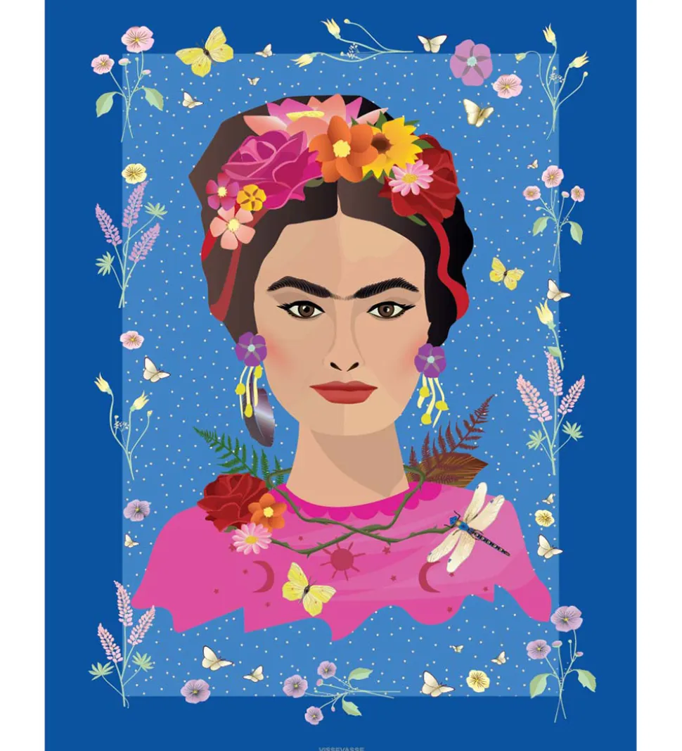 Farverig Vissevasse plakat med et smukt motiv af Frida Kahlo i pink, omkranset af blomster og sommerfugle på en blå baggrund. Et dekorativt element til børneværelset fra Vissevasse.