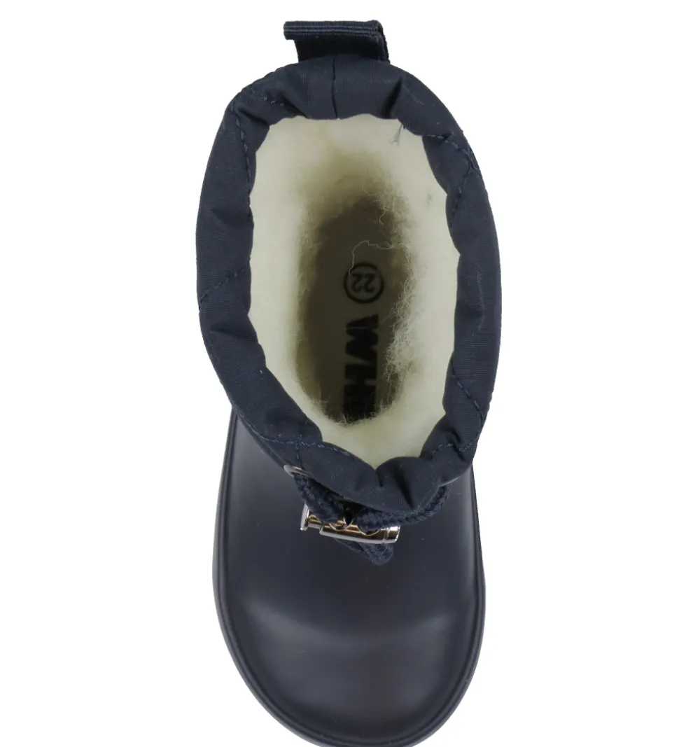 Skønne Wheat termostøvler i navyblå. Termostøvlernes hælkappe er med hælstrop og et fint Wheat-logo i refleksprint.