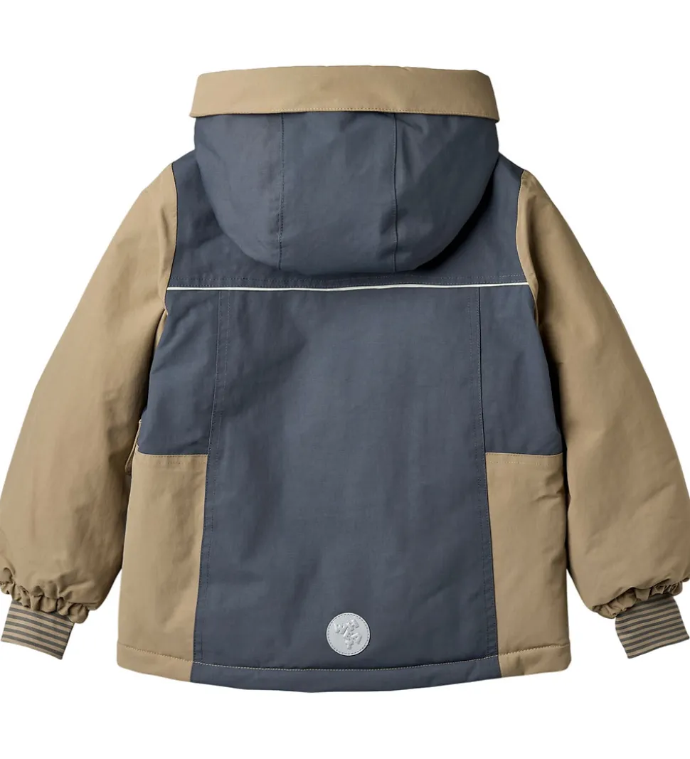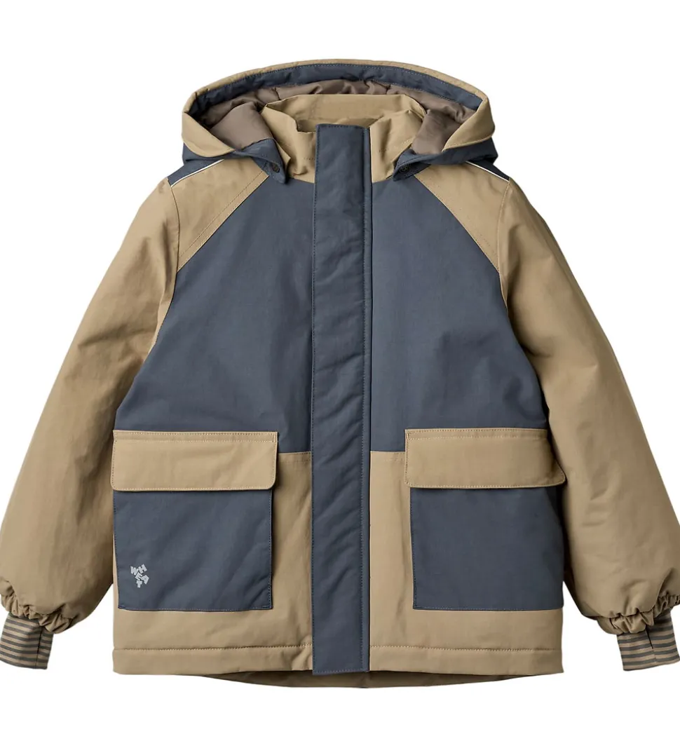 Fin Wheat vinterjakke i beige og gråblå og med velplacerede reflekslogoer og -detaljer.