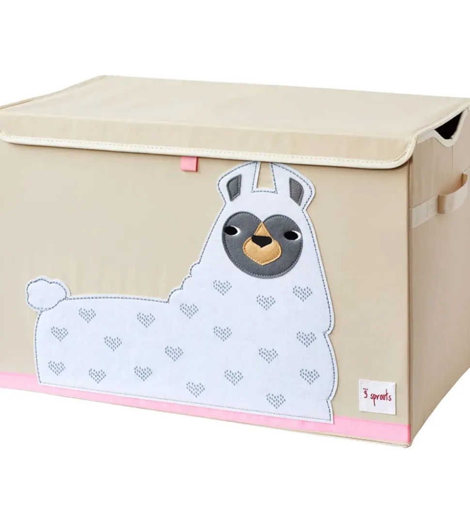 Sjov 3 Sprouts opbevaringskasse i beige med en sød, hvid lama på. Kassen har en firkantet og aflang facon med et foldbart låg foroven.
