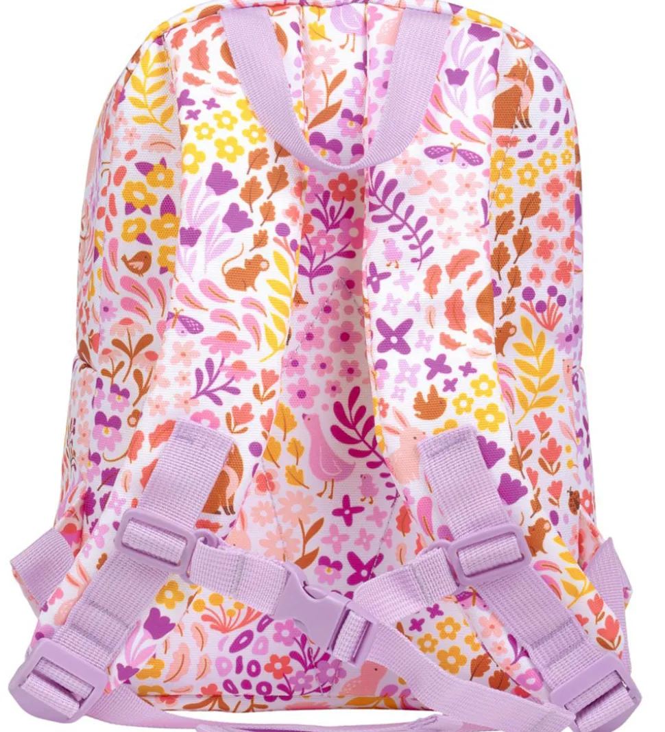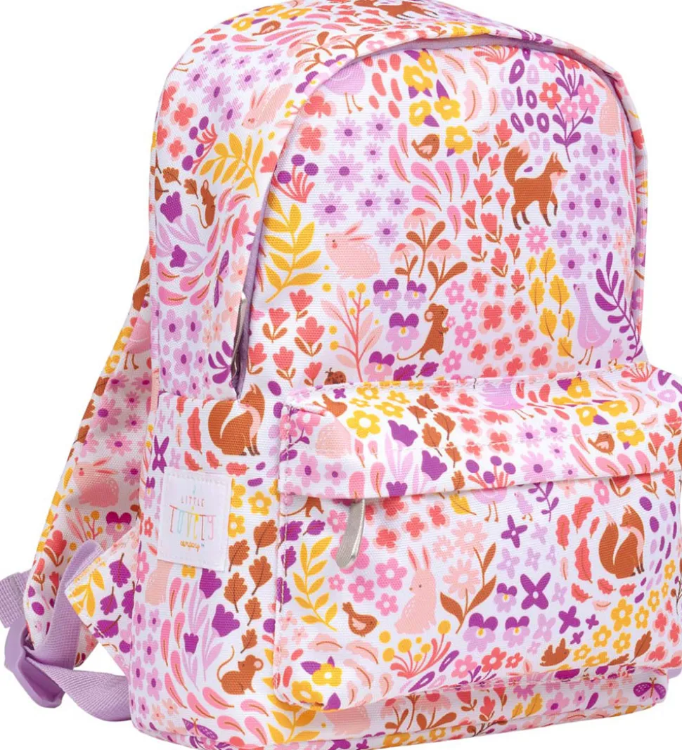 Sød A Little Lovely Company børnehavetaske i hvid et farverigt blomster- og dyreprint.