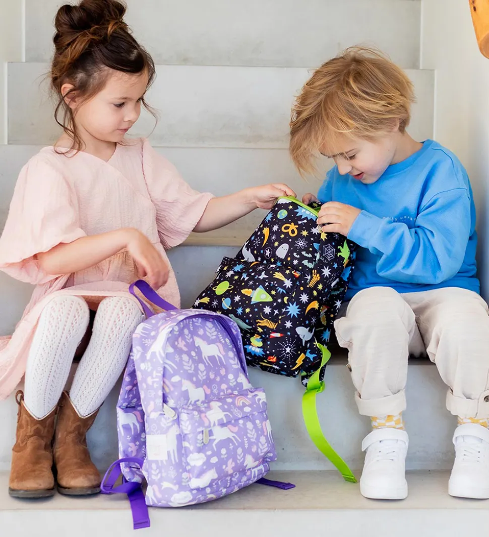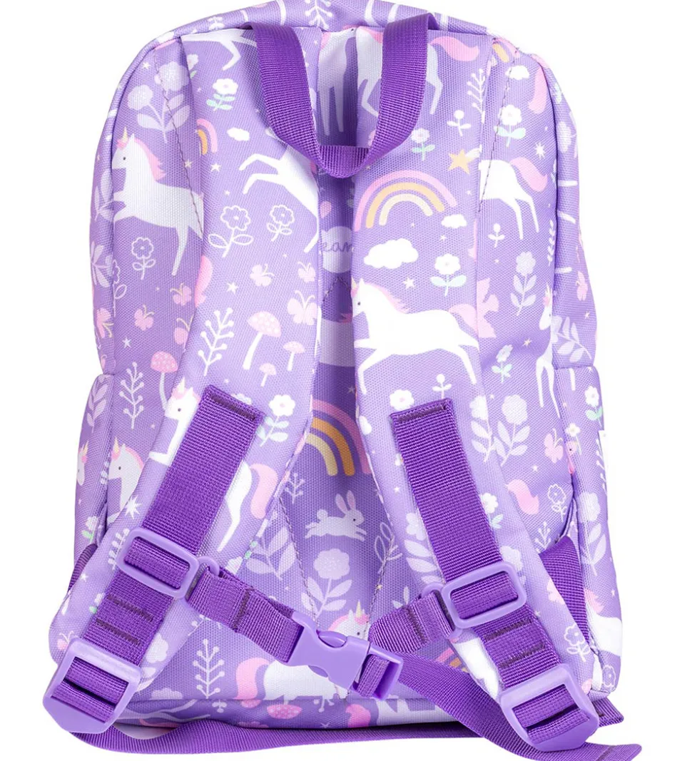 Sød A Little Lovely Company børnehavetaske i lilla med et alloverprint af enhjørninger, regnbuer, blomster og stjerneskud. Lynlåsen og remmene er lilla i en mørkere nuance.