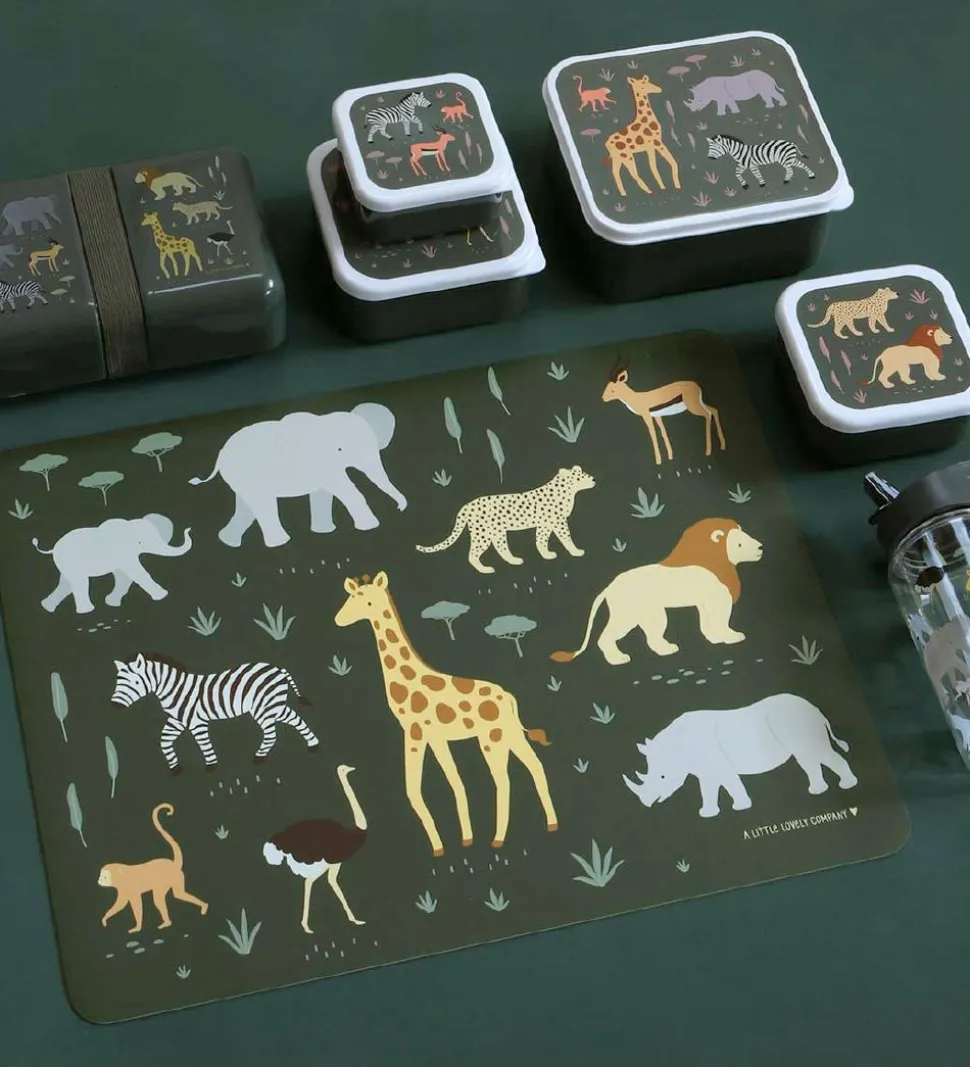Praktisk A Little Lovely Company dækkeserviet i mørkegrøn med et print af forskellige dyr fra savannen.