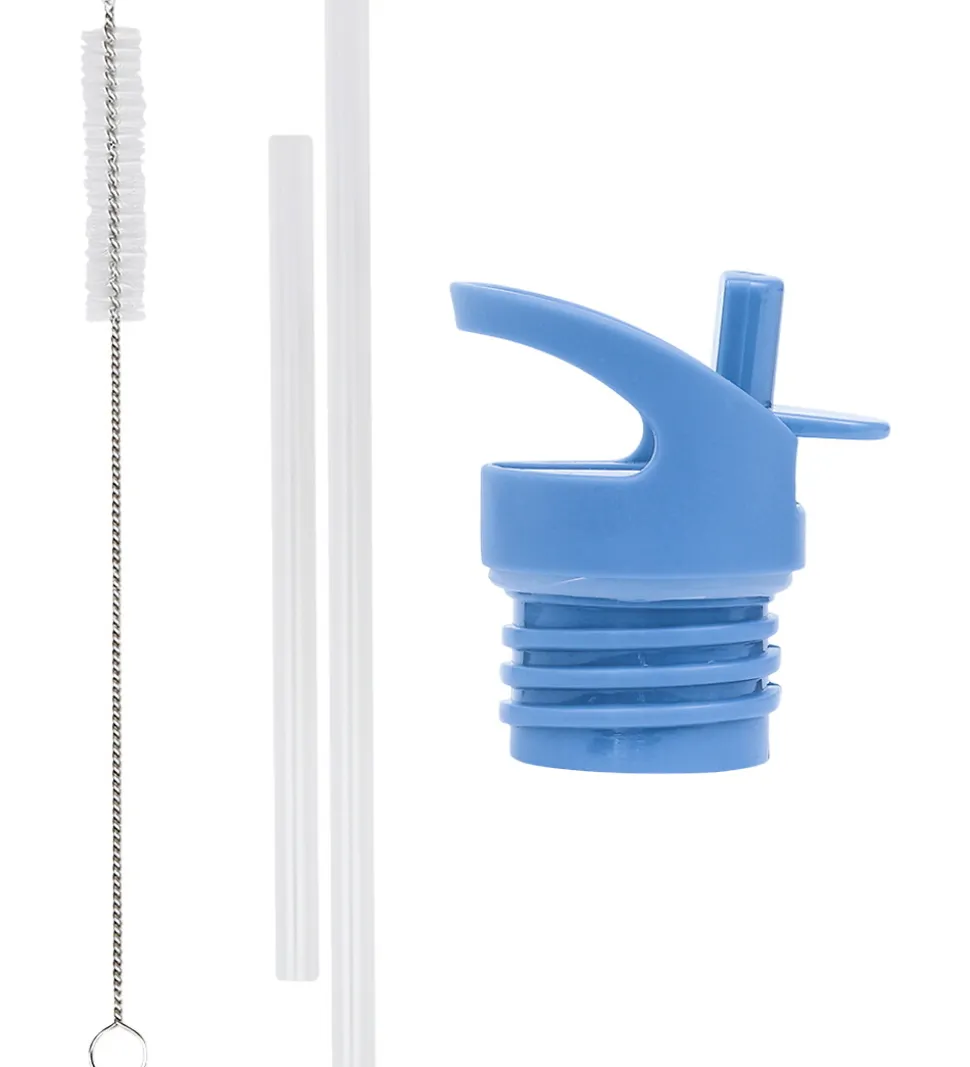 Fint A Little Lovely Company drikkedunksæt bestående af et blåt låg, to sugerør og en rengøringsbørste.
