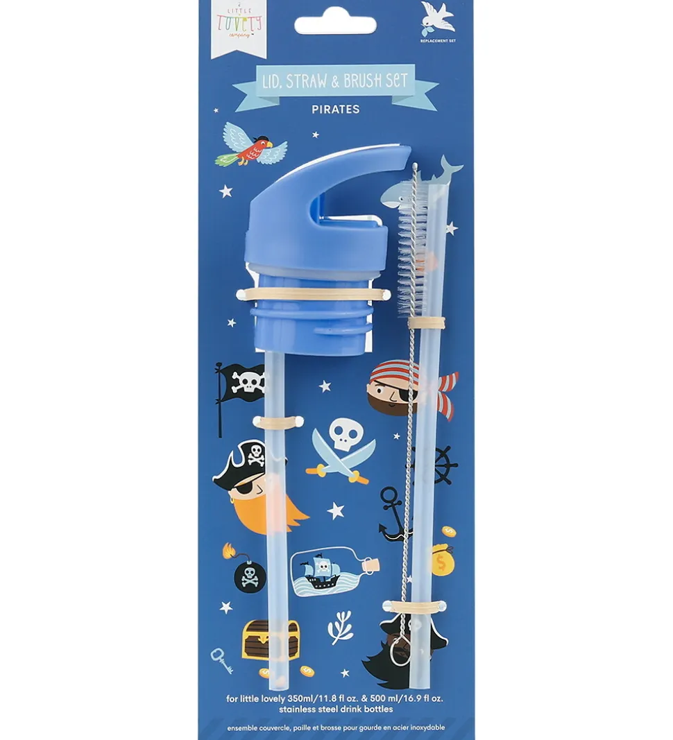A Little Lovely Company drikkedunksættet passer til mærkets egne drikkedunke af rustfrit stål. Låget har en smart hank samt en sportstud, som kan foldes op og ned. Låget lukker tæt takket være en praktisk silikonekant. Rengøringsbørsten er nem at bruge på de medfølgende sugerør.