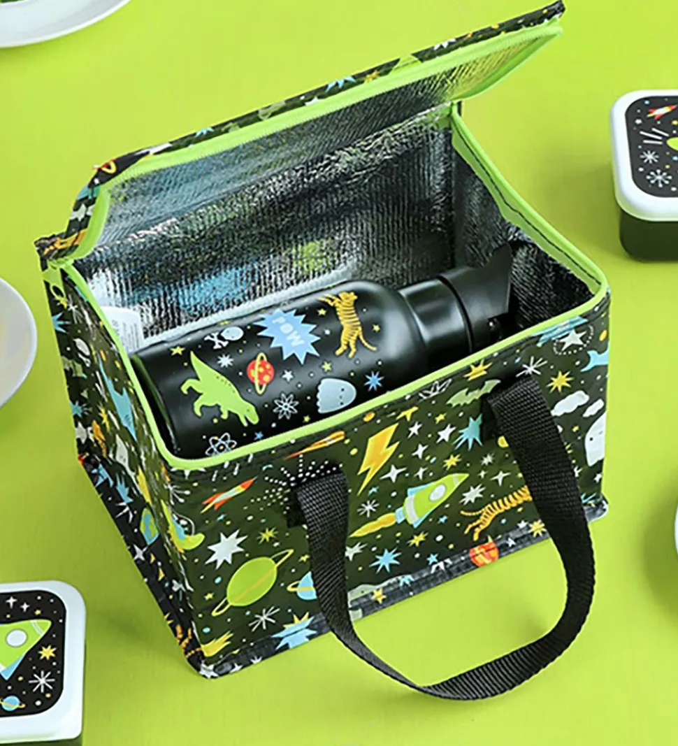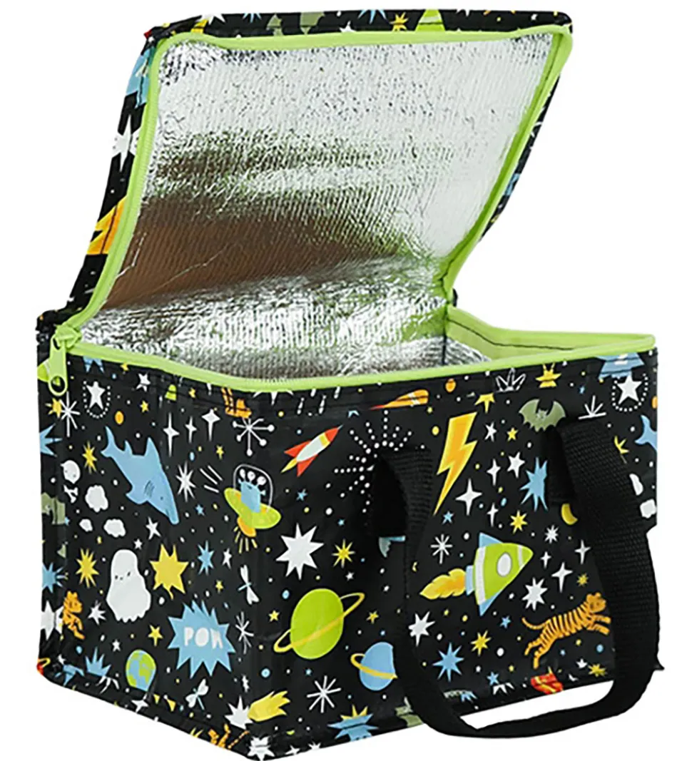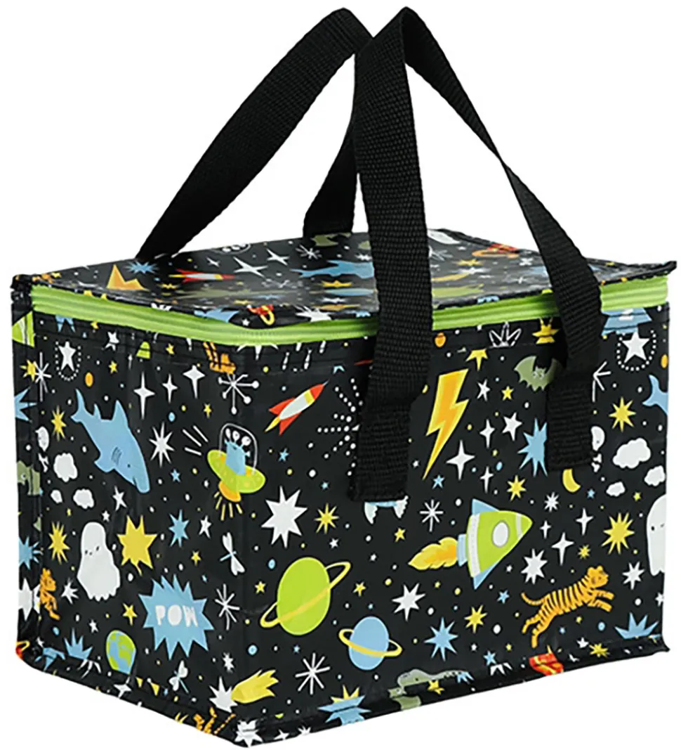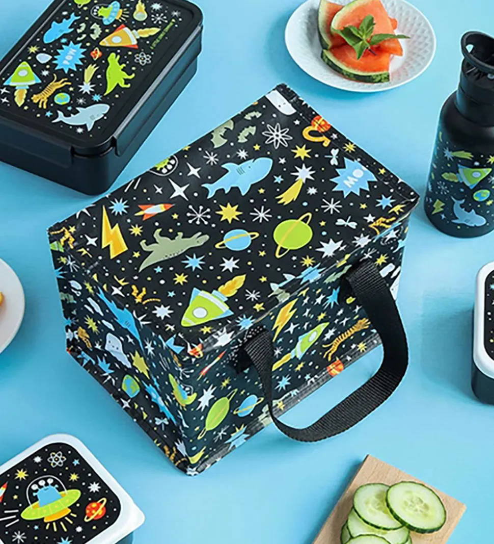 Fin A Little Lovely Company køletaske i sort med et rumprint i mange farver.