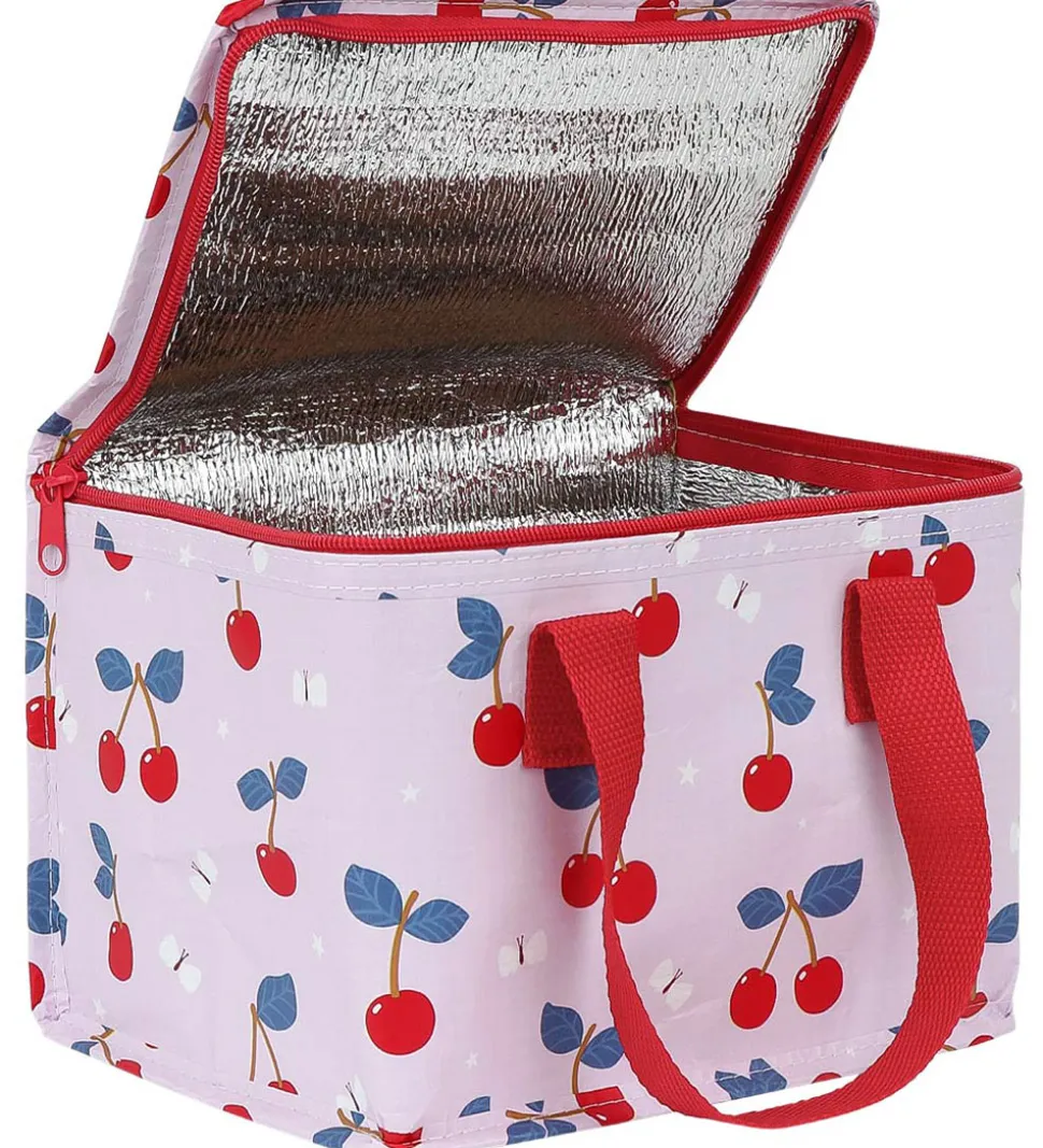 Sød A Little Lovely Company køletaske i lys rosa med print af blå og røde kirsebær og hvide sommerfugle og blomster. Køletasken har røde håndtag og lynlås.