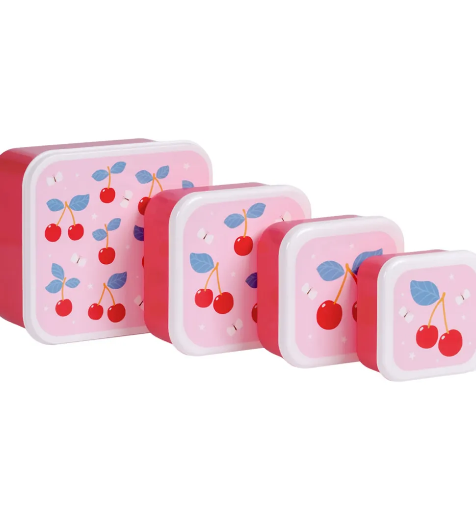 Sødt A Little Lovely Company madkassesæt betående af 4 madkasser i rosa nuancer med kirsebærprint. A little Lovely Company madkassesættet har en kvadratisk form og indeholder fire forskellige størrelser. Låget er aftagelig, og madkasserne kan praktisk lægges i lag.