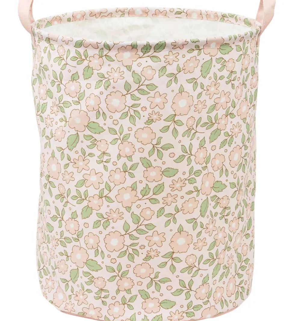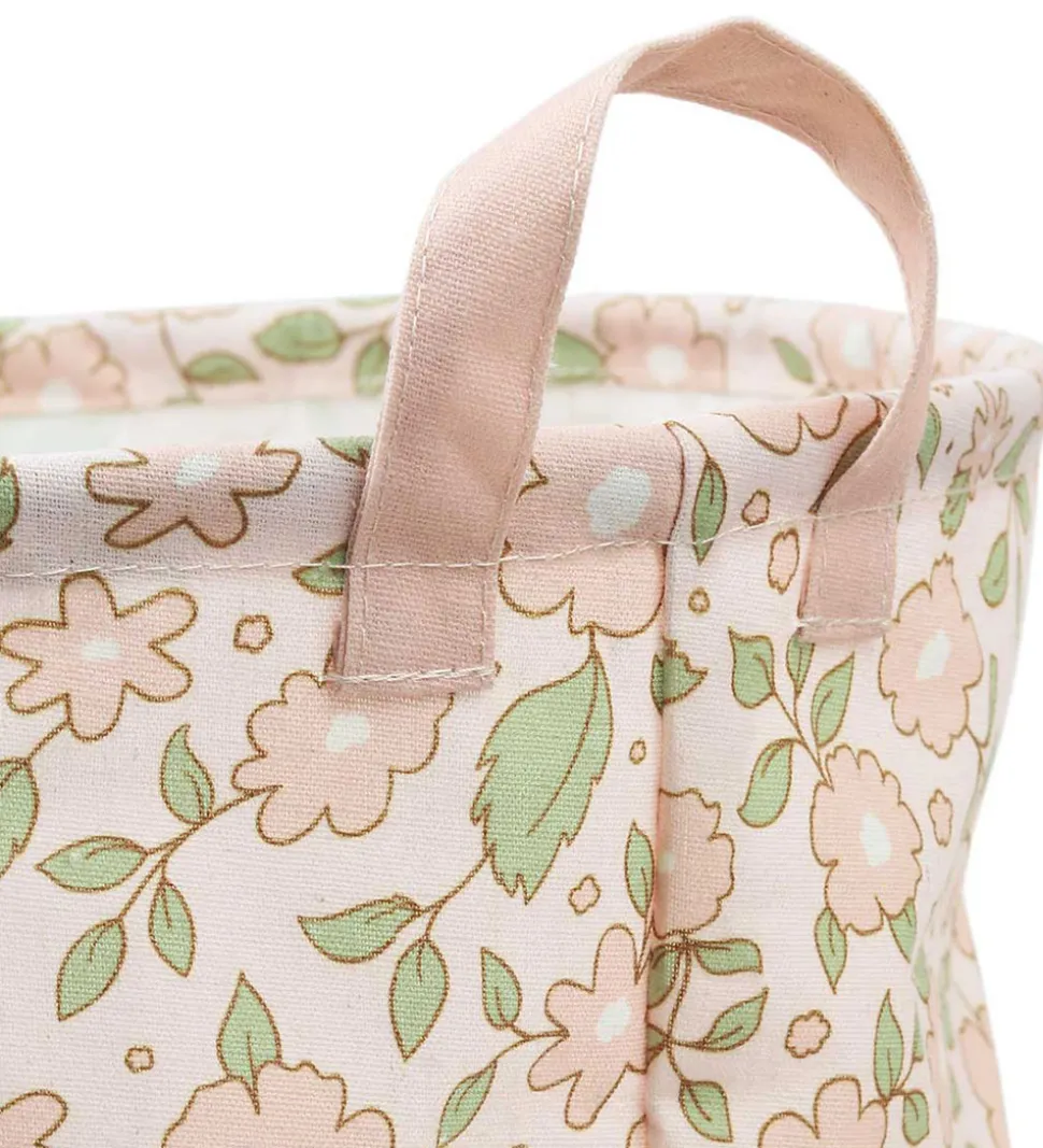 Pæn A Little Lovely Company opbevaringskurv i rosa med et alloverblomsterprint i rosa og grønne nuancer.
