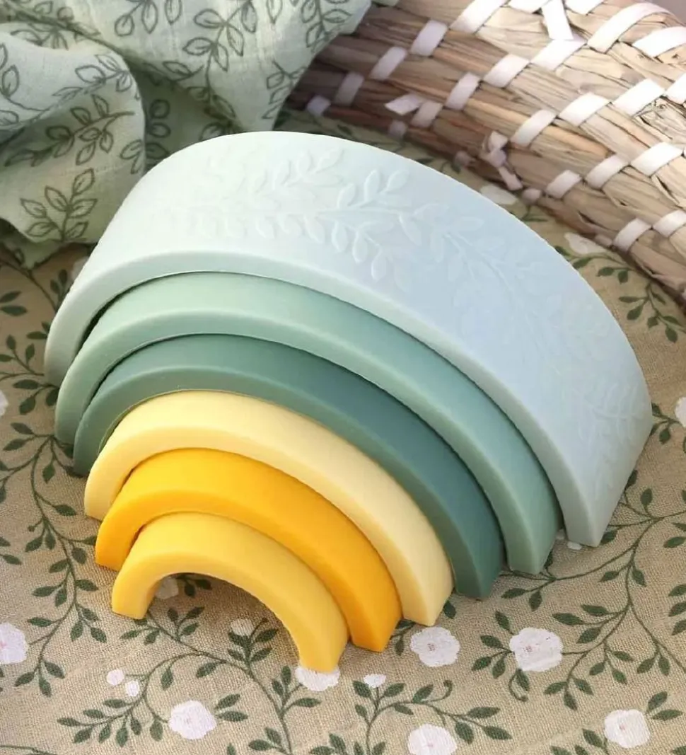Sjovt A Little Lovely Company stablelegetøj, bestående af seks dele af en regnbue i forskellige farver. Den yderste del har blade i materialet.
