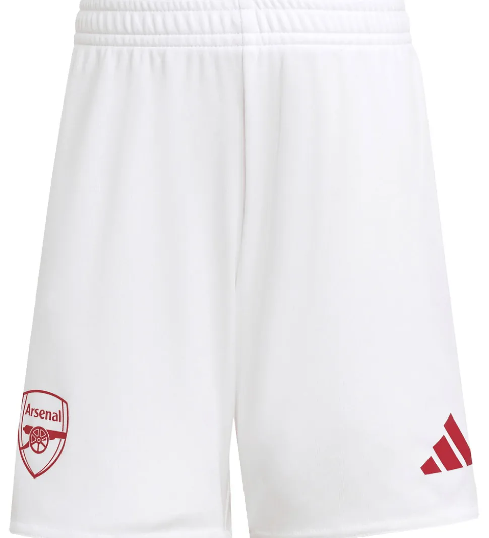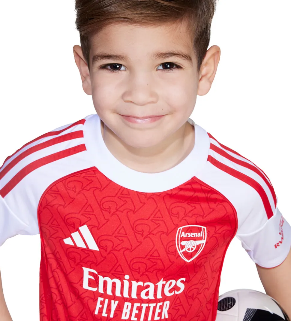 Flot adidas Performance fodboldsæt, bestående af en t-shirt og et par shorts, samt et par lange, røde strømper. T-shirten er i rød med allover print af et flot Arsenal print og hvide ærmer. På begge skuldre er der de klassiske adidas striber, og på venstre ærme er der et reklametryk med teksten “Visit Rwanda”. Trøjen har et markant reklametryk af hovedsponsoren Emirates, og logoer på fronten. Shortsene er hvide med logoprints på lårene fortil.