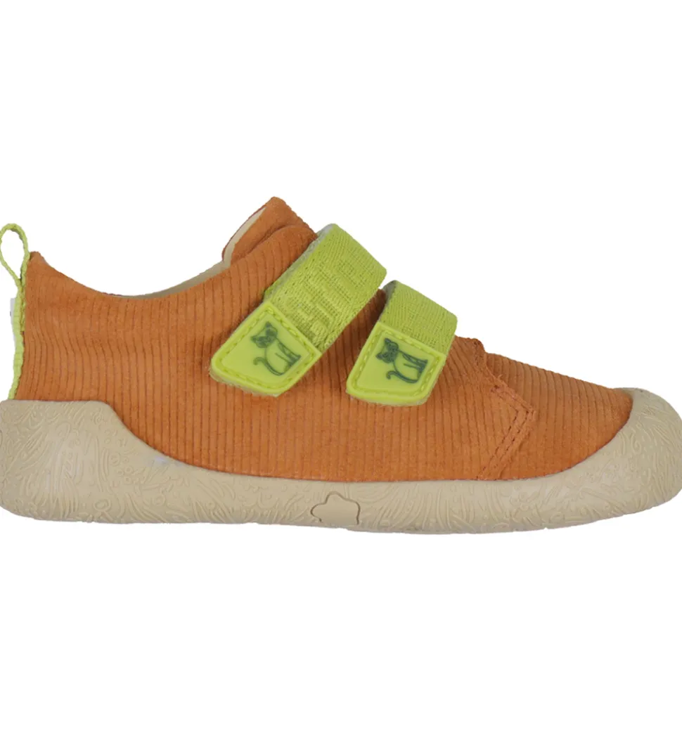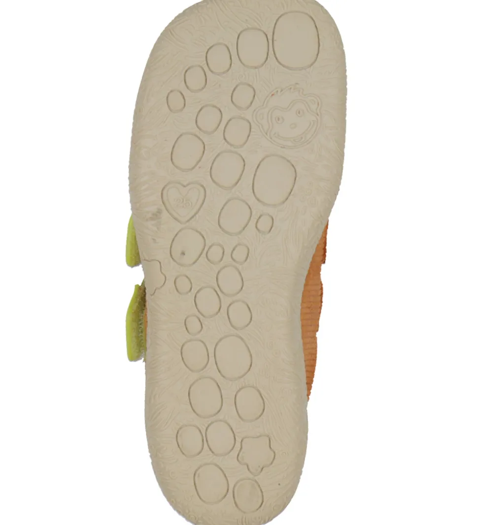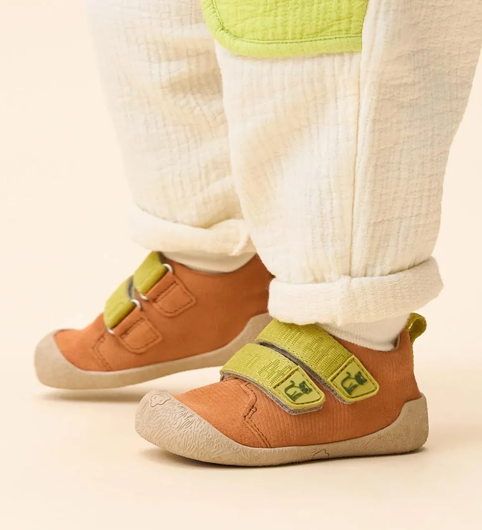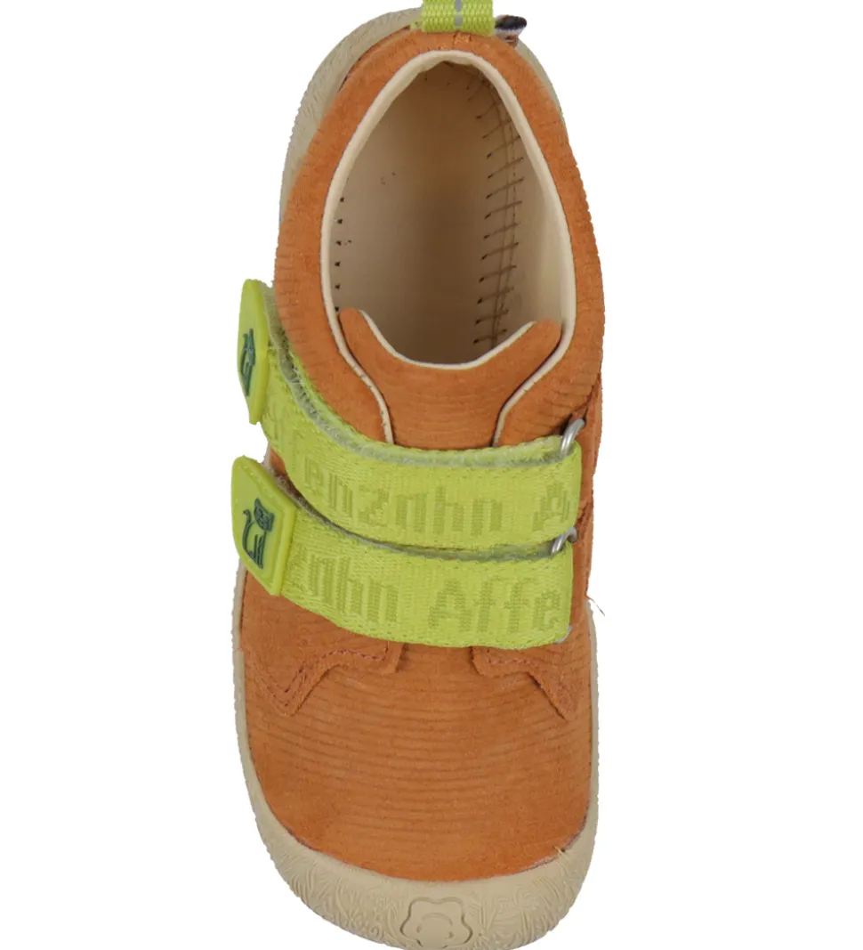 Fine Affenzahn begyndersko i brændt orange ruskind med en stribet struktur. Begynderskoene har gule detaljer og lysebrune ydersåler.