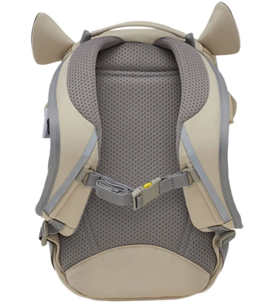 Rygsækken har polstret ryg og polstrede skulderremme, som er beklædt med åndbart mesh. Skulderremmene kan justeres i længden, og der er et praktisk, justerbart brystspænde, som sikrer at tasken sidder godt og behageligt på det lille barn. Rundt om maven er der en refleks stribe og i toppen er der en smal hank, så den kan bæres både i hånden og over skuldrene.