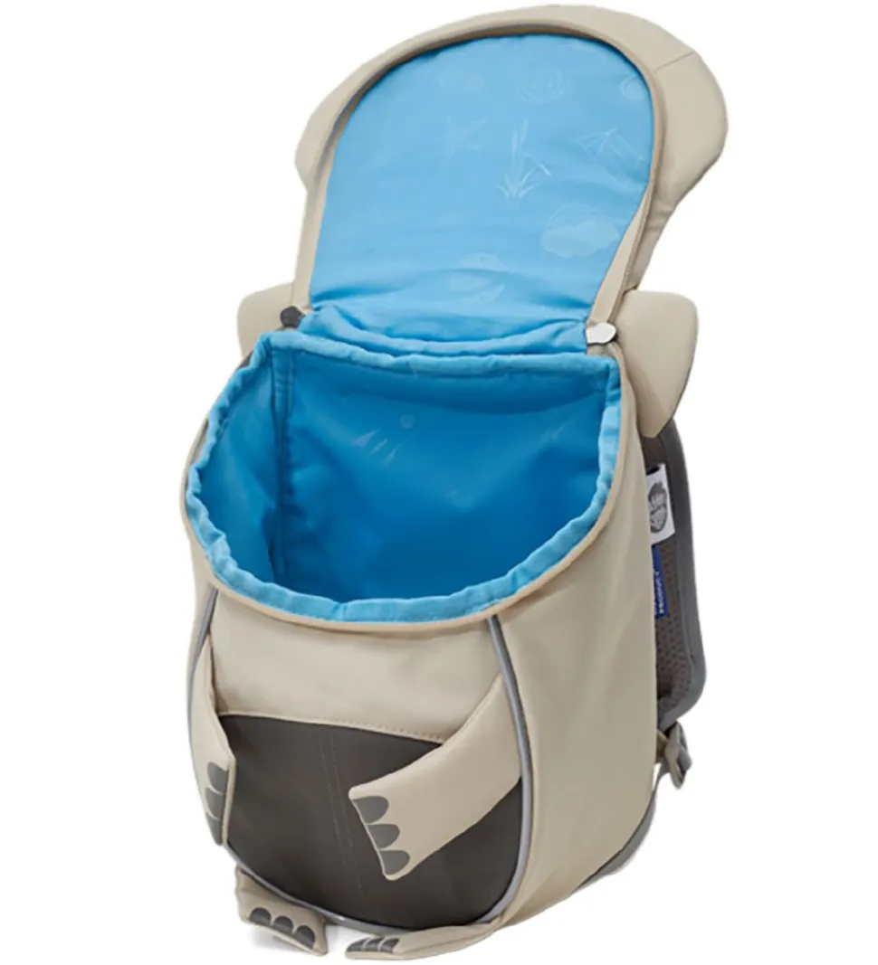 Affenzahn rygsækken består af et stort rum, som åbnes rundt om undersiden af hovedet med en dobbelt lynlås. Tasken er lyseblå på indersiden.