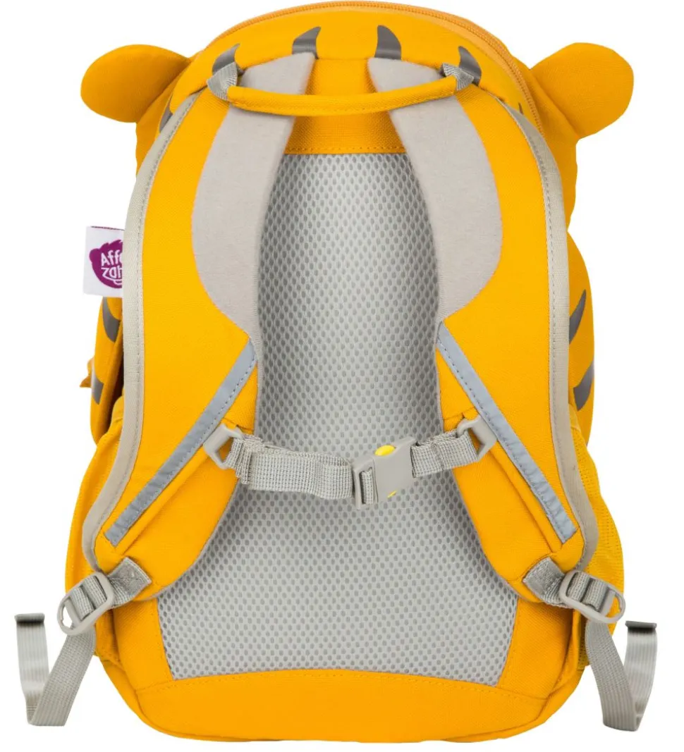 Fin Affenzahn rygsæk i gule nuancer med form som en tiger. Fortil er der to øjne i hvid og sort samt en rosa tunge. Tungen sidder fast med en elastik, så når man trækker i den kommer der et navneskilt frem. På tigerens brune fødder er der reflekser.