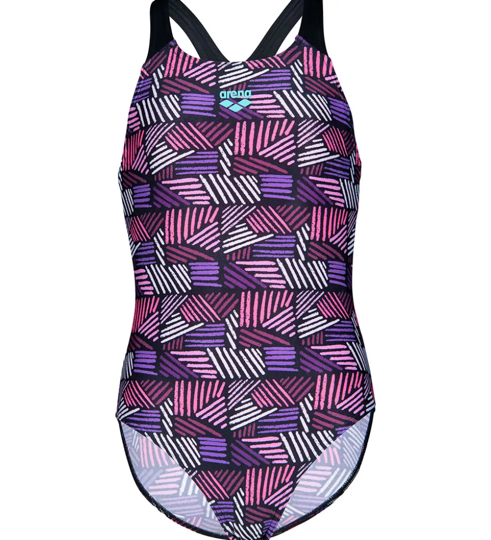 Smart Arena badedragt sort med et øjnefaldende mønster med vandrette og lodrette linjer i lilla, pink og hvid.