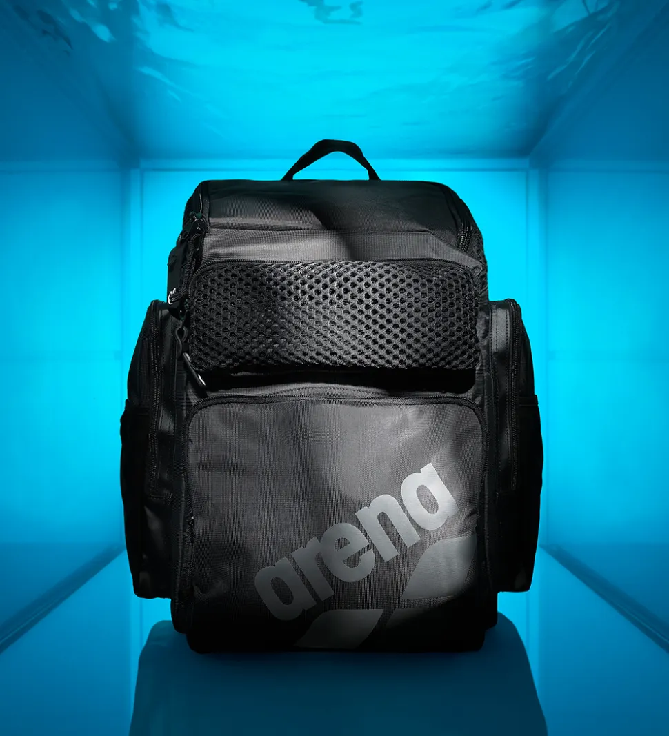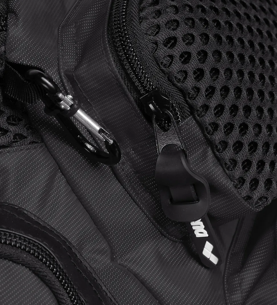Arena rygsækken er stor og rummelig, og den har plads til en masse sportsudstyr. Rygsækken åbnes i toppen med en lynlås med to skydere, og den består af ét stort rum. Ind mod ryggen sidder der en stor lomme af neopren, hvor der er plads til en bærbar computer på op til 15″, og ud mod fronten er der en anden stor lomme. I siderne sidder der store lynlåslommer med store lommer med elastikkant udenpå, og på fronten sidder der to lynlåslommer, hvor den ene er lavet af kraftigt mesh.