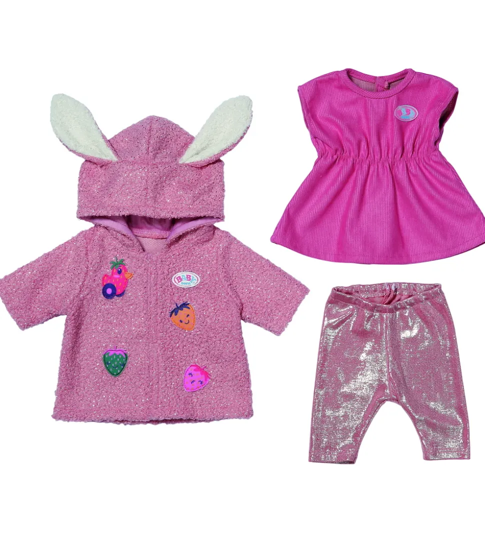 Skøn BABY born dukketøj med teddyfrakke i rosa med glimmer og søde frugt-patches. Sættet inkluderer også en kjole og et par bukser.