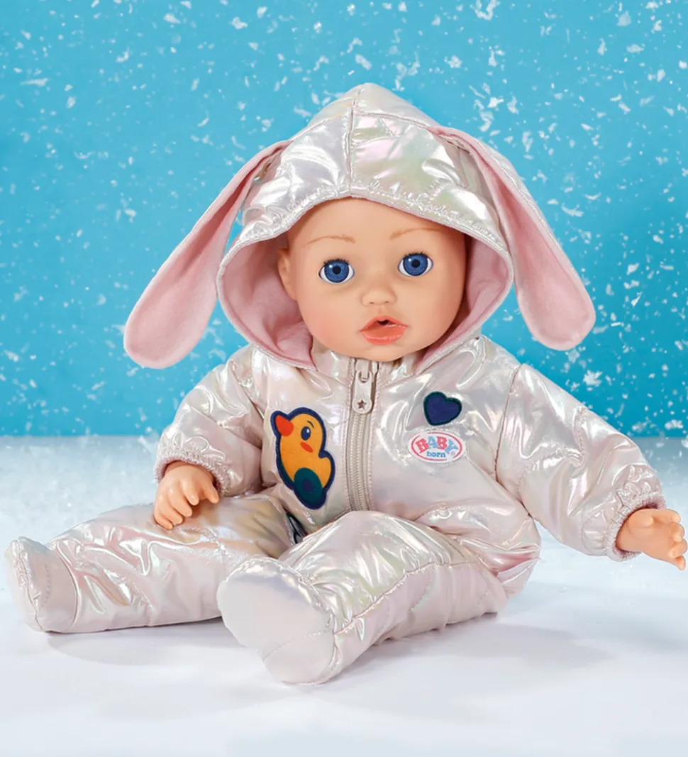 Skøn BABY born dukketøj i en smuk skinnende perlemorsfarve med et sødt print af en glad blomst, en and og et æble. BABY born dragten har korte ærmer og en hætte med fine kaninører.