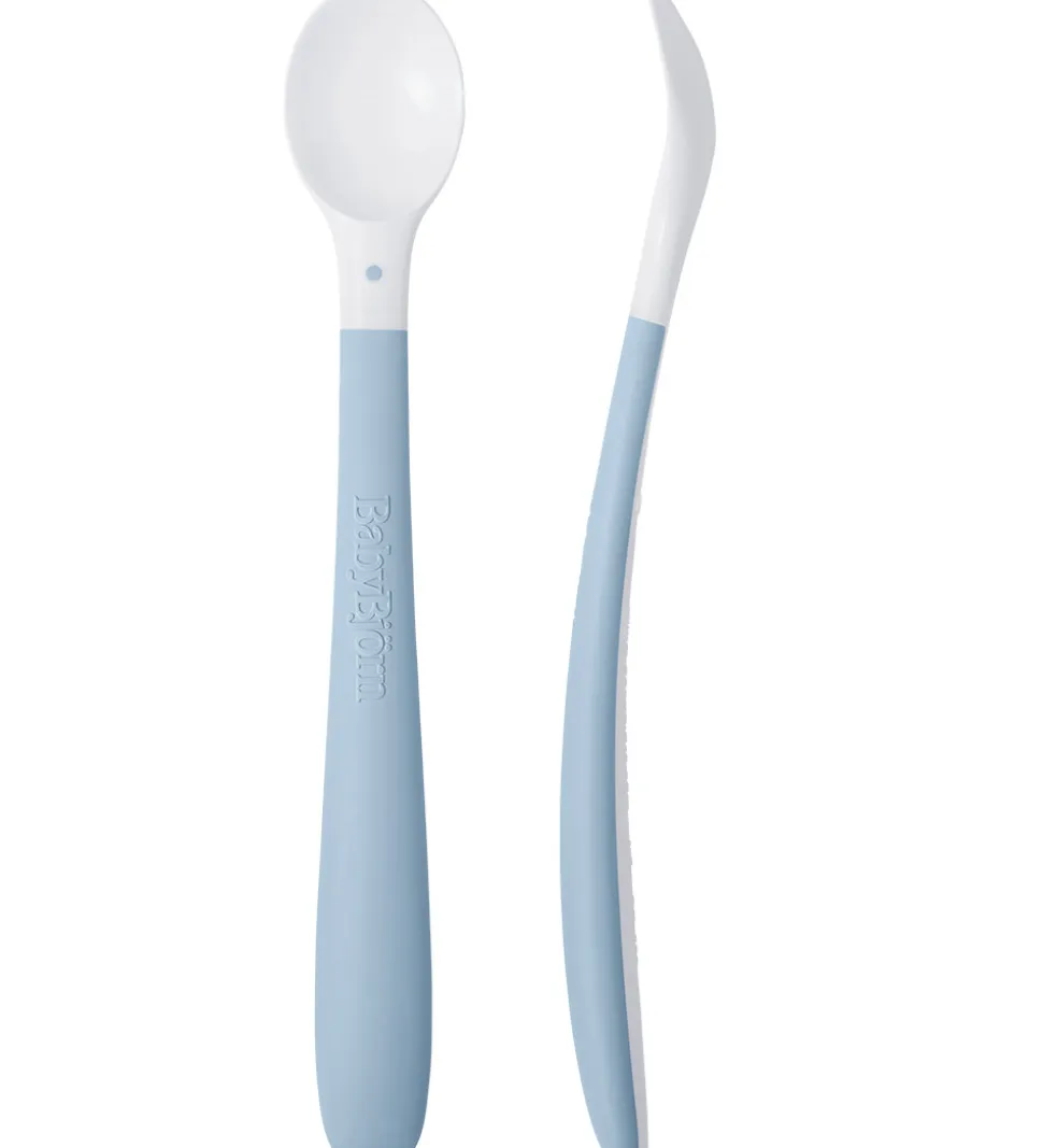 Smarte BabyBjörn skeer i lyseblå og hvid solgt i en 2-pak. Skeerne er lette at holde om og har et lille skeblad.