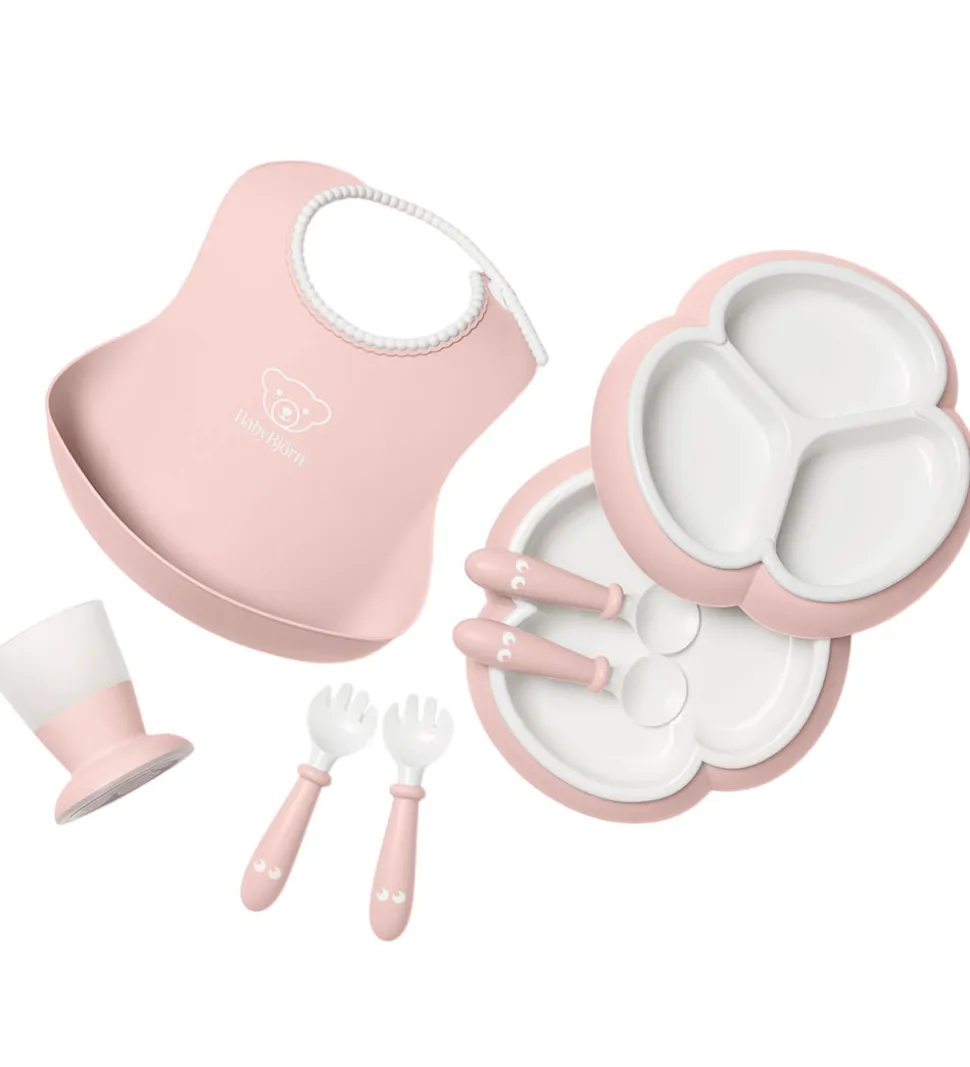Fint BabyBjörn spisesæt i lys rosa og hvid bestående af følgende otte dele: