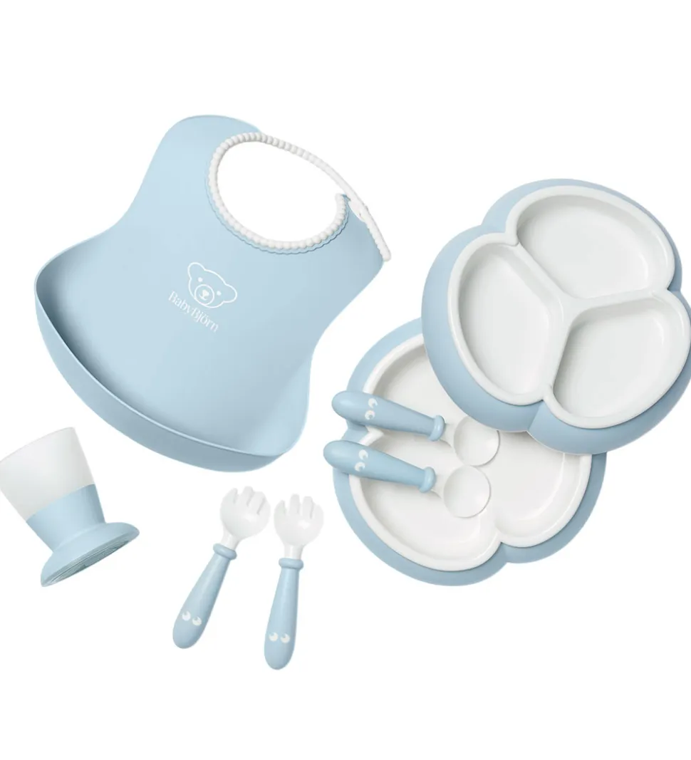 Flot BabyBjörn spisesæt i lyseblå og hvid bestående af følgende otte dele: