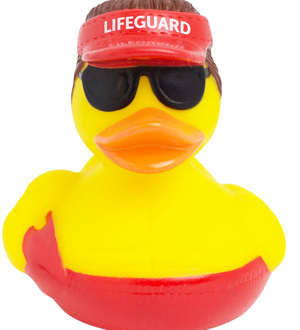 Skøn badeand som ligner en livredder med solbriller på.