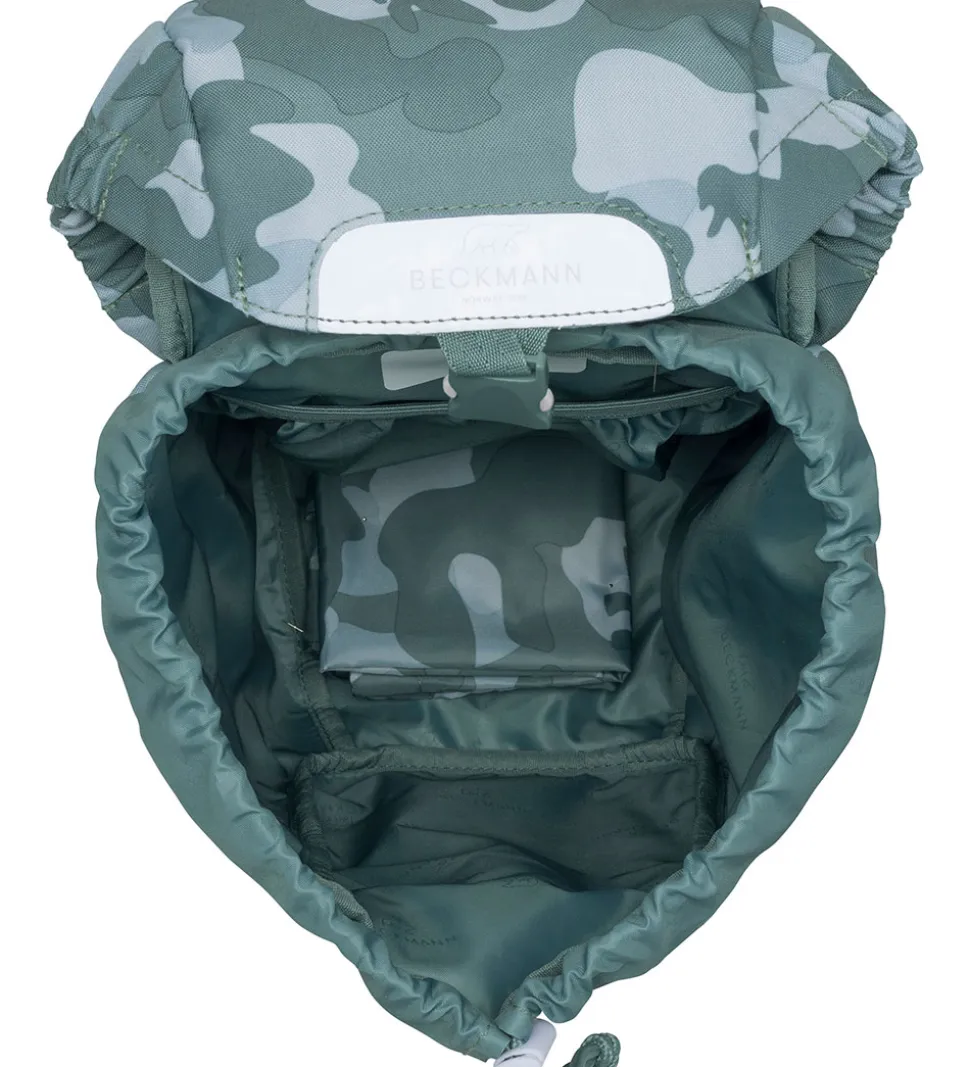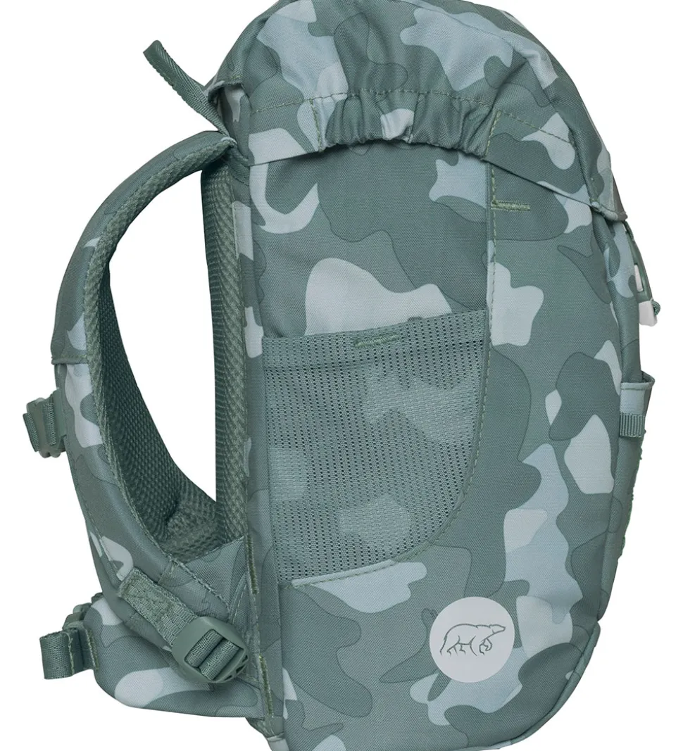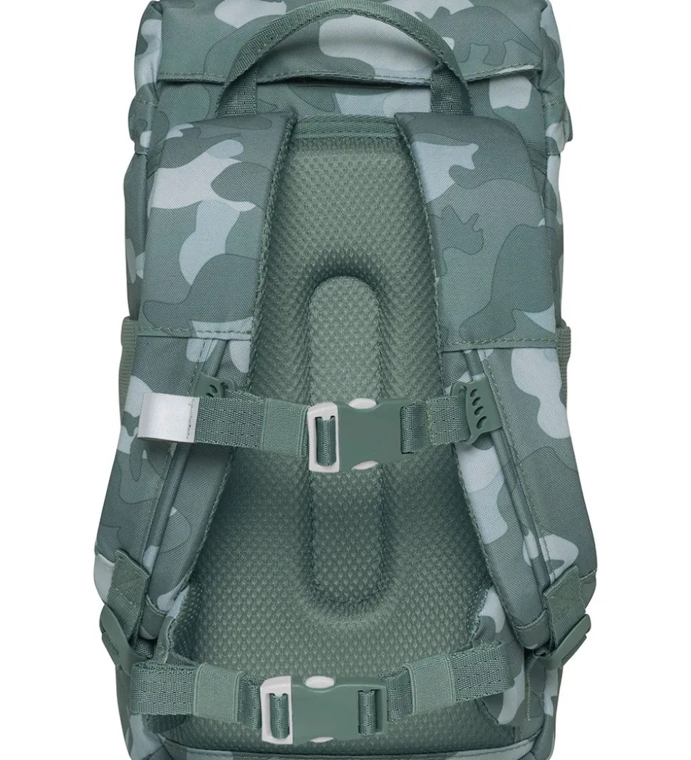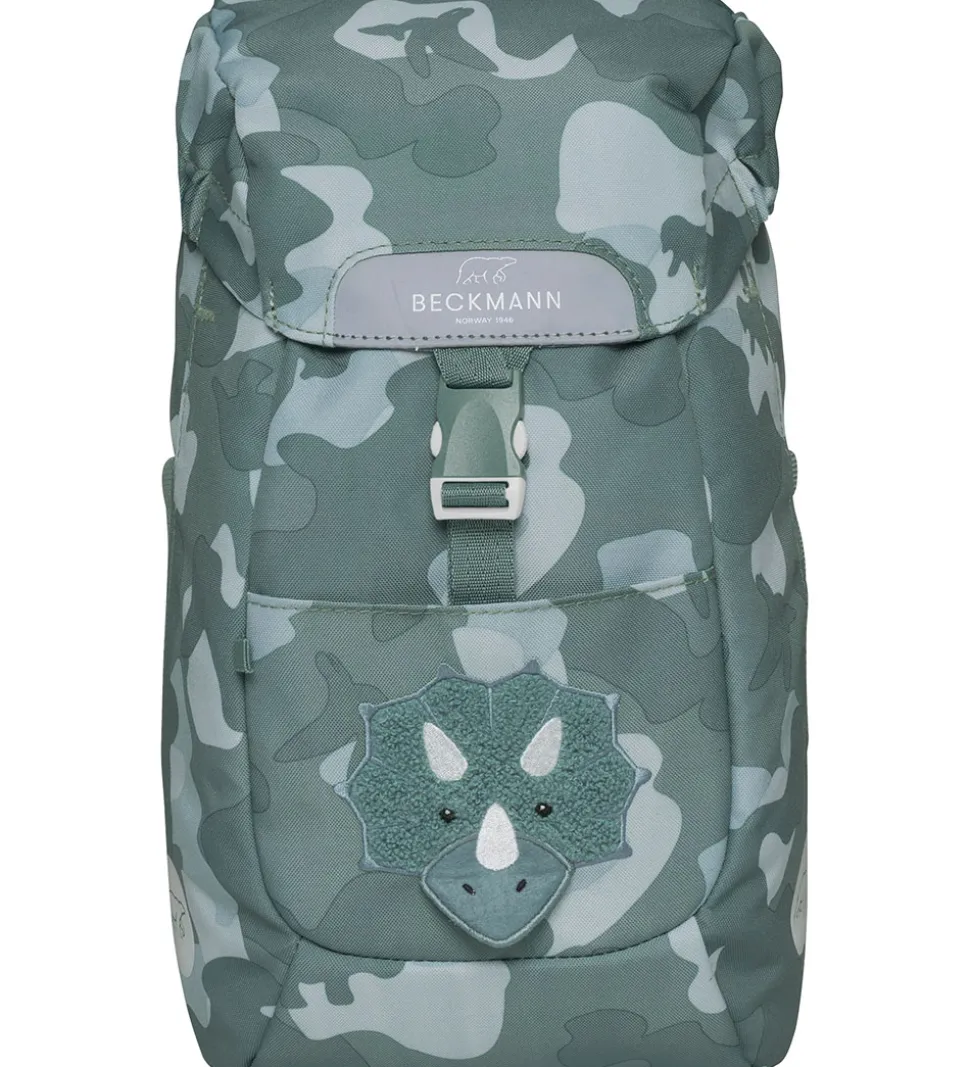 Fin Beckmann børnehavetaske i et camomønster med grå og grønne nuancer og med en 3D-dinoapplikation fortil.