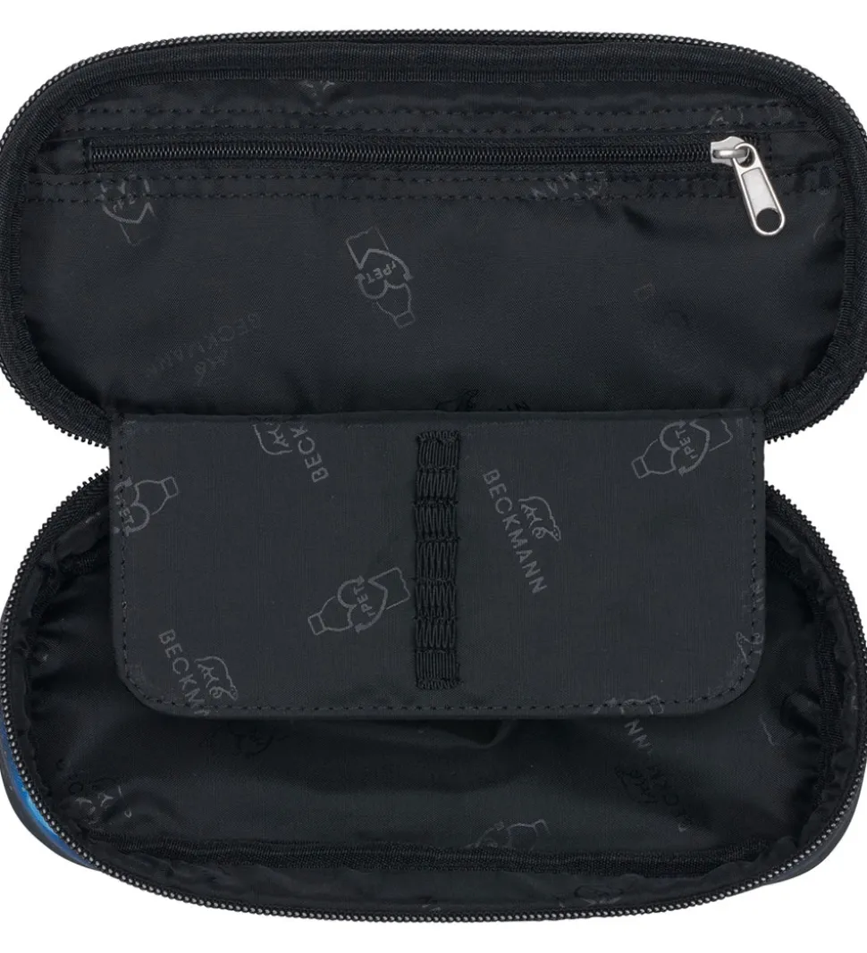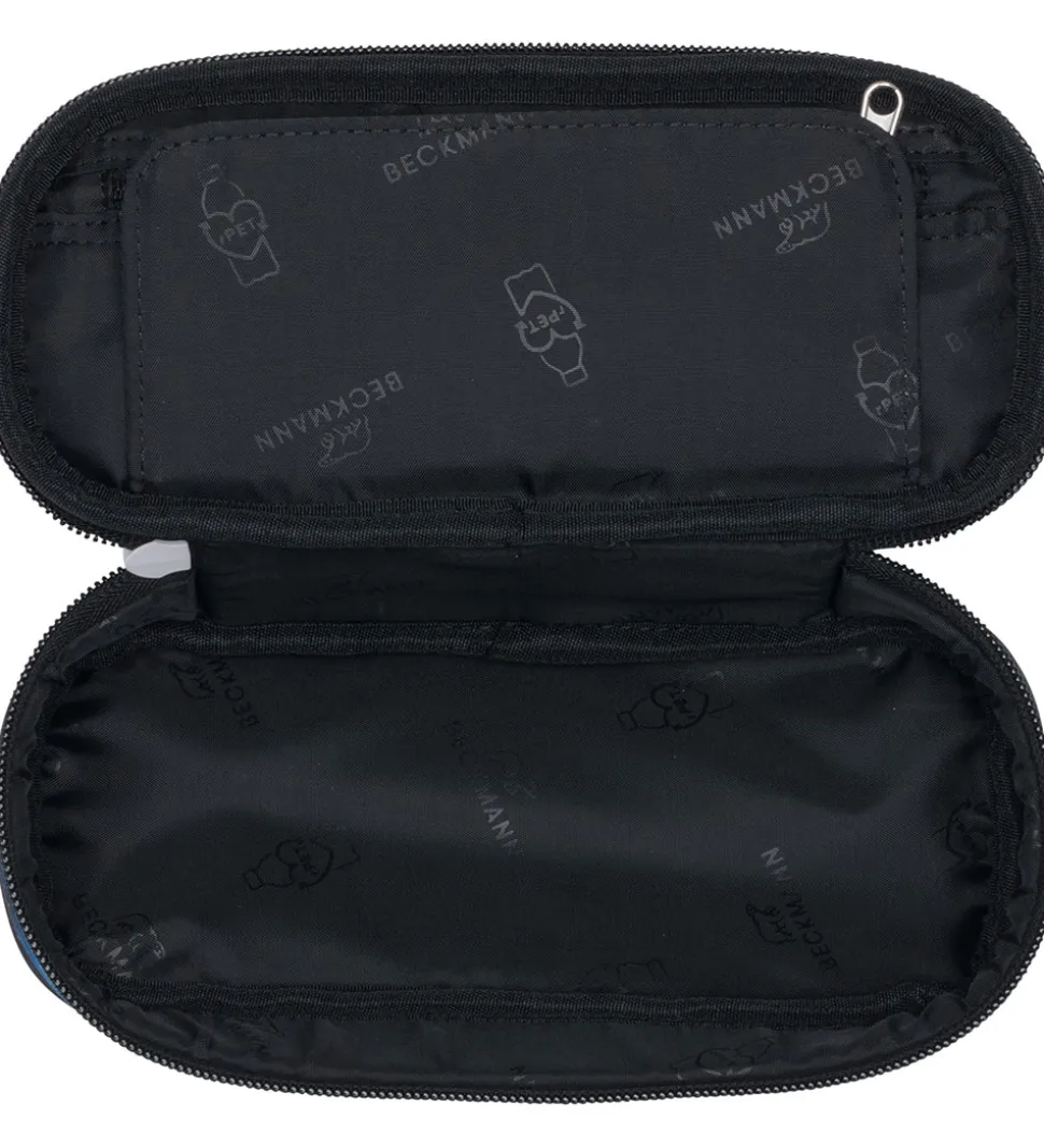 Beckmann penalhuset er et boks-penalhus med faste sider. Det åbnes med en lynlås, og i låget er der en lynlåslomme. Penalhuset består af ét stort rum, og ved lynlåsen hænger der en fast plade med elastikstropper på oversiden til blyanter, farver el.lign.
