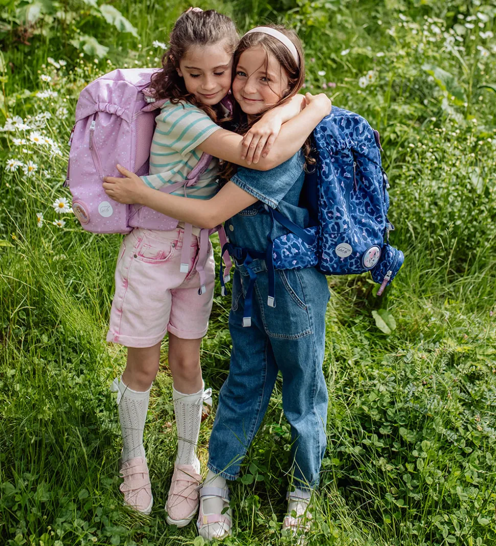 I klappen foroven er der et praktisk regnslag i neongul. Der medfølgeren en fin lille taske med ekstra velcromærker, så tasken kan dekoreres og tilpasses barnets helt egen stil ved at skifte mellem 5 forskellige velcromærker.