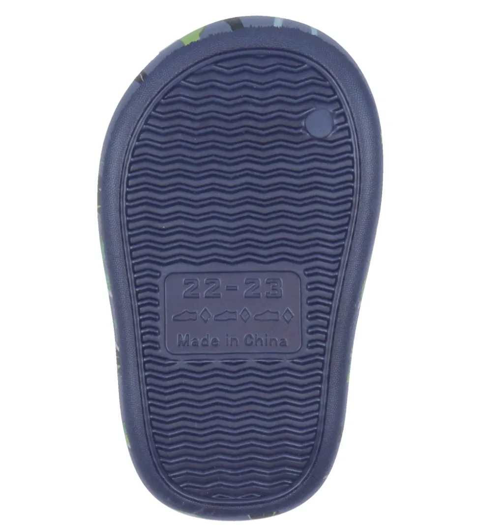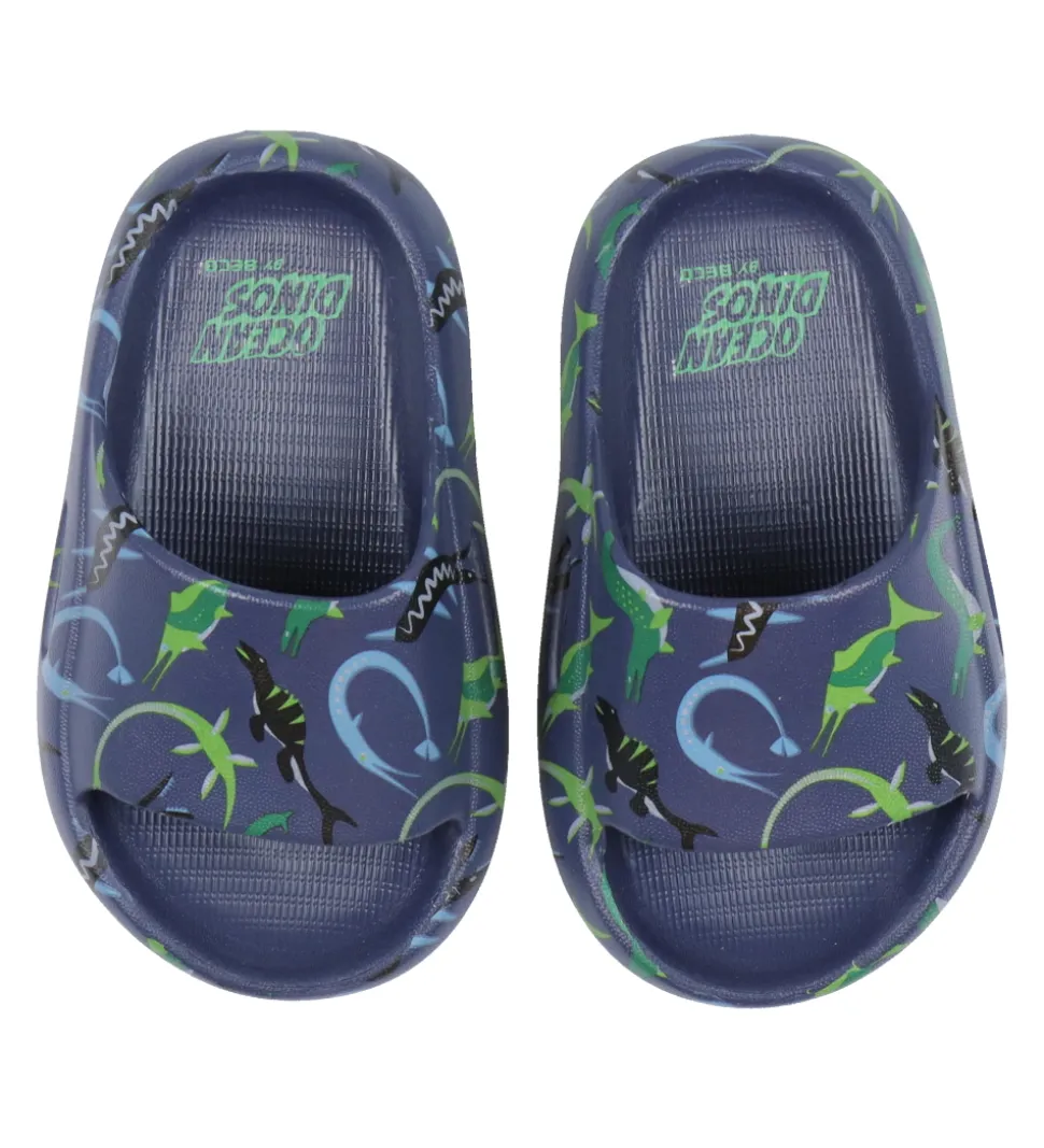 Lækre BECO badesandaler i mørkeblå med et alloverprint af forskellige vand dinosauerer i flotte farver.