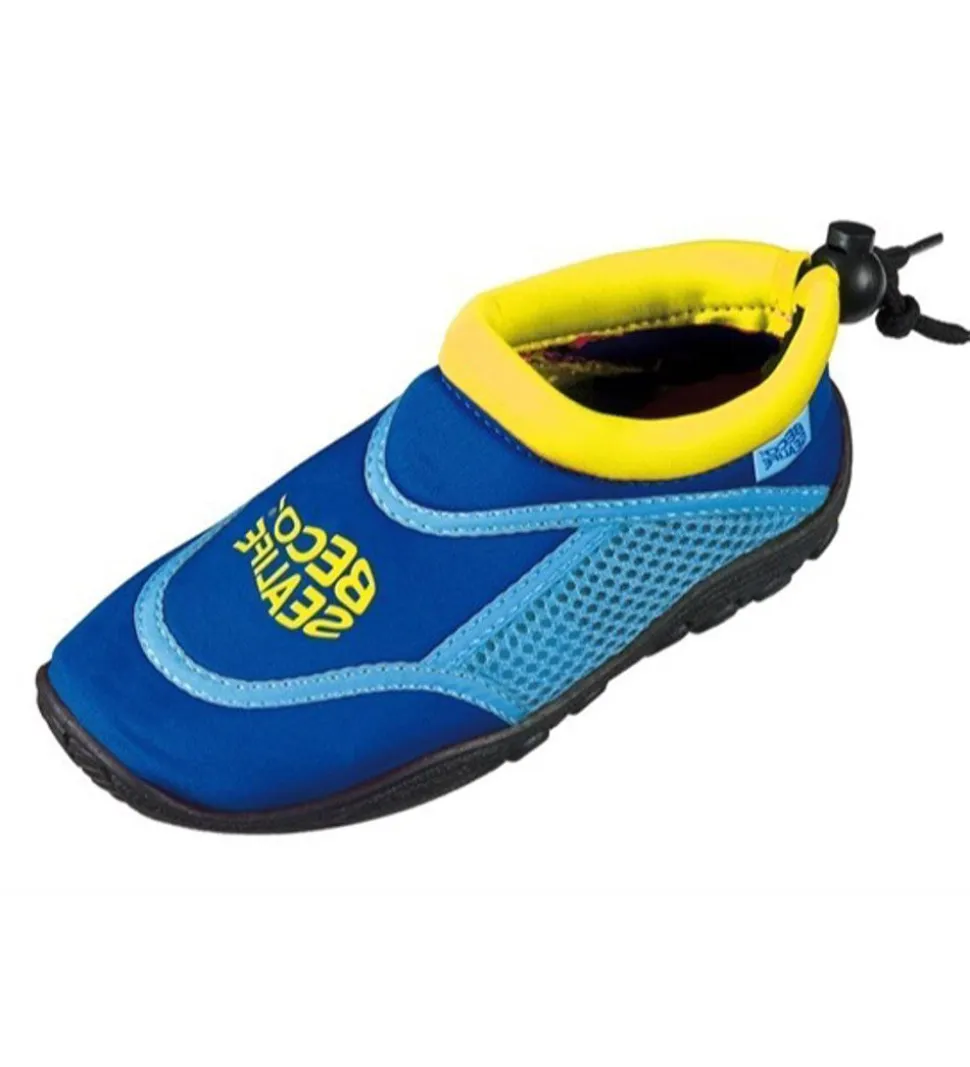 BECO badeskoene har en yderside af neopren og med meshdetaljer på siderne. Omkring anklerne kan de strammes ind med en sort elastiksnøre. Indvendigt er der en sål, som let kan tages ud af skoene. Badeskoene har en ydersål af fleksibelt gummi med mønster, som går op mod snuden og hælen og sikrer god fodfæste og beskyttelse.