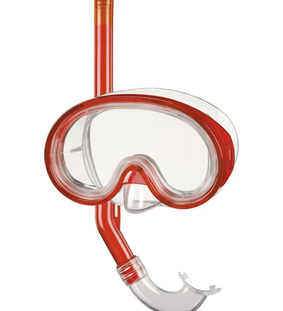 Fin BECO snorkelsættet indeholder en svømmemaske og en snorkel. Svømmemaske i transparent med en rød kant om glasset, og snorklen er også i rød med transparante dele.
