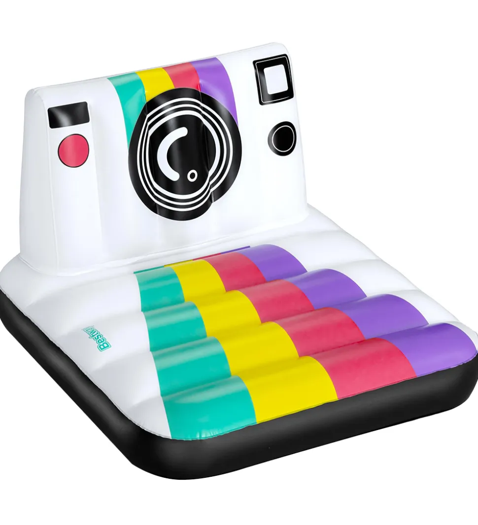 Sjov Bestway flyder lavet som et polaroidkamera i hvid, sort og med regnbueprint.