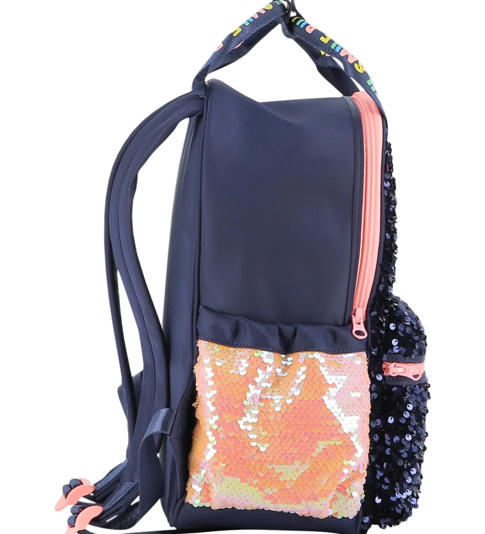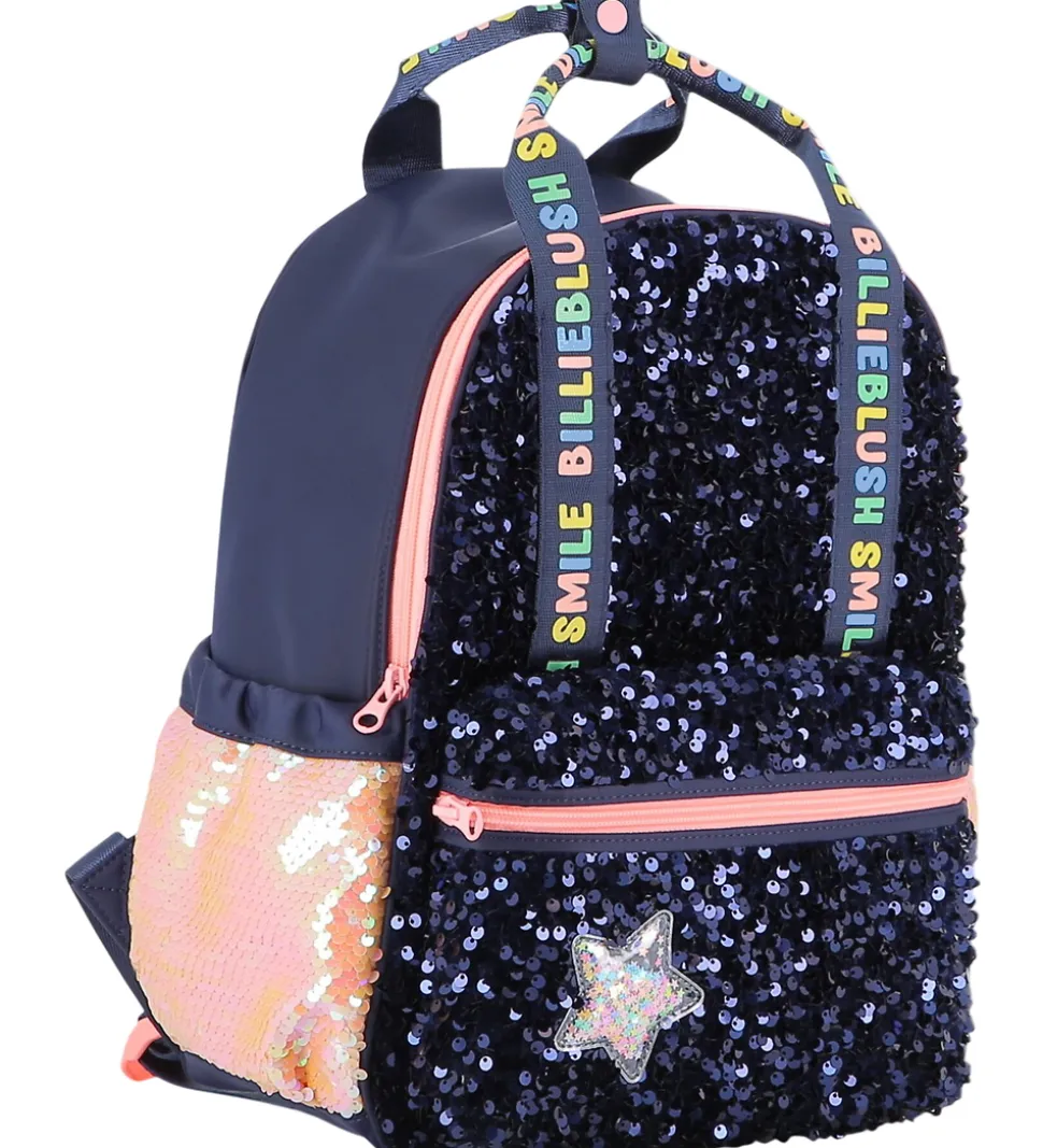 Sej Billieblush rygsæk i navyblå og rosa med palietter og en stjerne på fronten med små, farverige palietter indeni. Rygsækken har farverige logoprint på remme på fronten og i toppen.