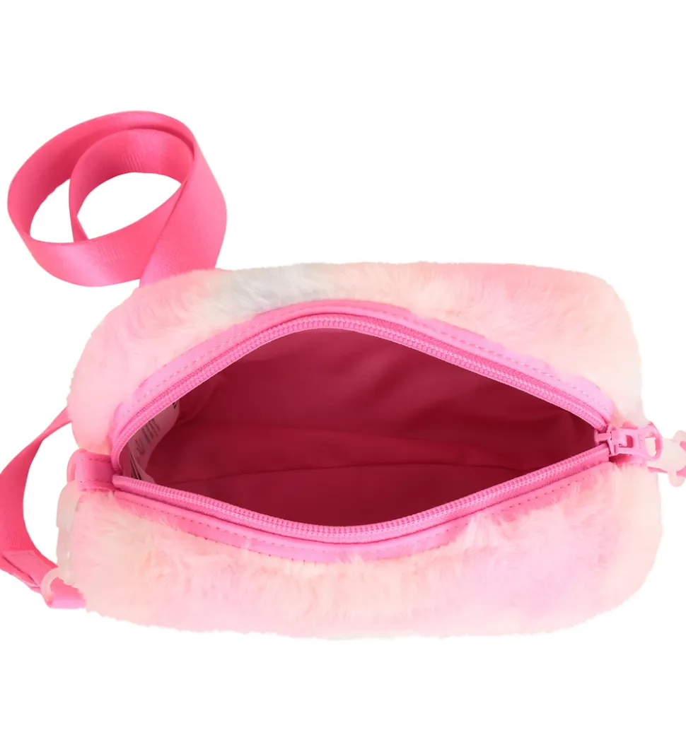 Smart Billieblush skuldertaske i pink og blåt plys med en stor, farverig applikation på fronten af et hjerte og fire stjerner med palietter.