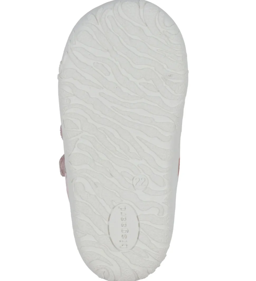 Bisgaard begynderskoene lukkes med velcroremme over vristen, så de let og hurtigt kan tilpasses til barnets fod. Indvendigt er de foret med lyst skind med ekstra polstring omkring åbningen. I bunden er der bløde, udtagelige indersåler. Begynderskoene har en bred tåboks, så det er plads til at tæerne kan bevæge sig frit. Ydersålen går op over snuden og hælen, så skoene er godt beskyttet mod slid.
