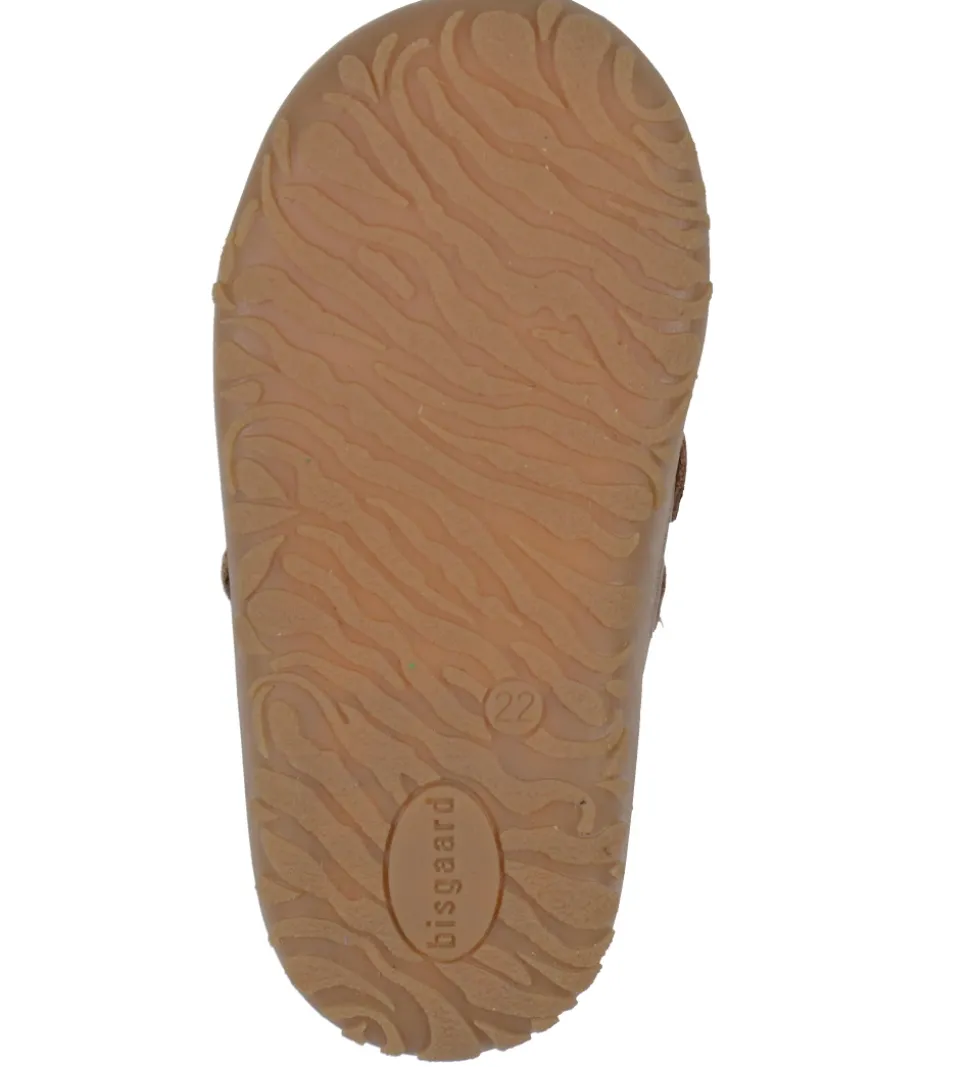Bisgaard begynderskoene lukkes over vristen med to velcroremme, så de nemt kan tilpasses barnets fod. På indersiden er de foret med blød skind, og bagtil er der en fast hælkappe. Indersålen er blød og udtagelig.