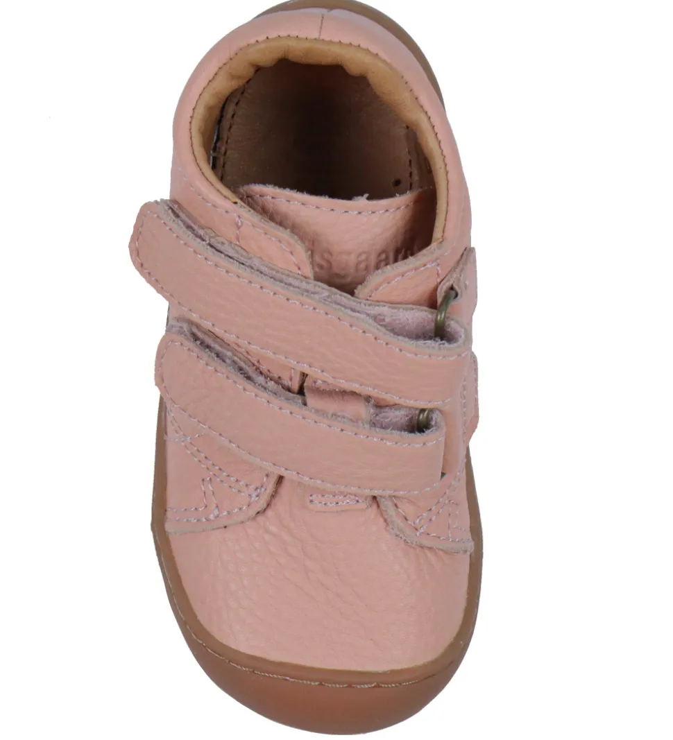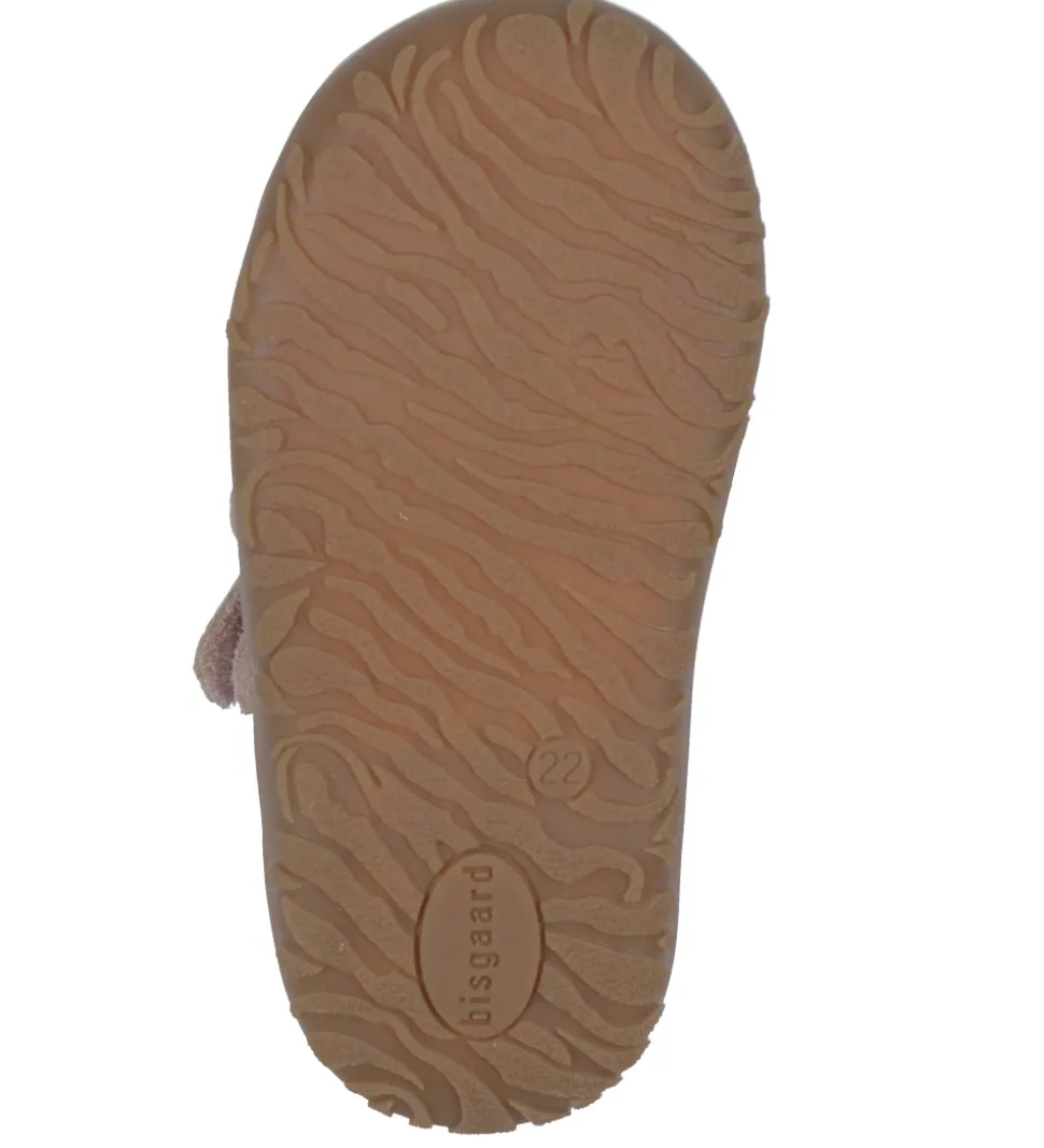 Bisgaard begynderskoene lukkes over vristen med to velcroremme, så de nemt kan tilpasses barnets fod. På indersiden er de foret med blød skind, og bagtil er der en fast hælkappe. Indersålen er blød og udtagelig.