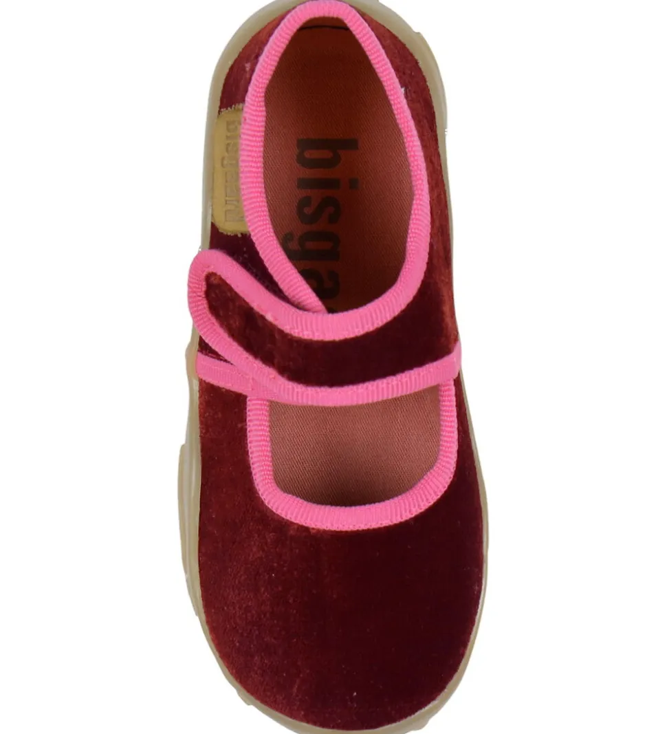 Skønne Bisgaard hjemmesko i bordeauxfarvet velour med kanter i pink.