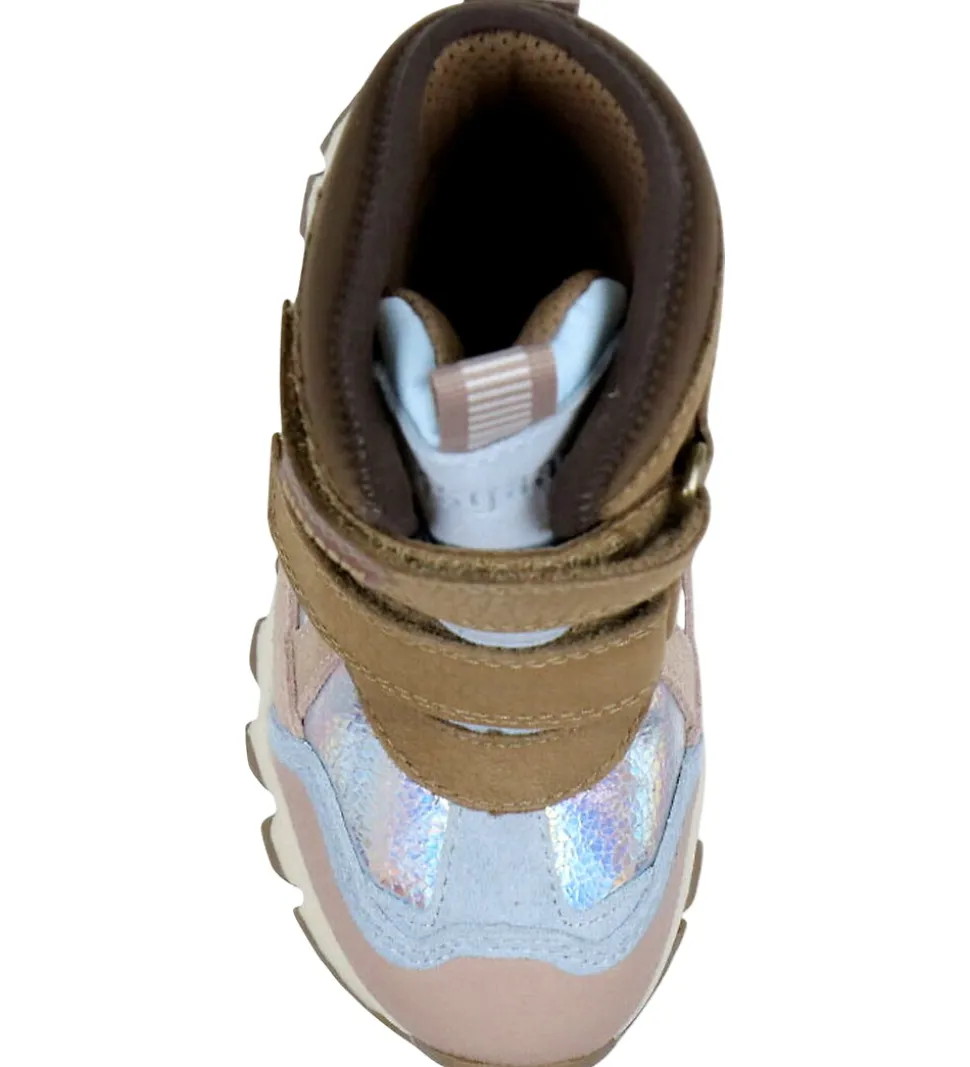 Skønne Bisgaard støvler i brunt, rosa og gult skind og ruskind med detaljer i metallisk sølv. Støvlerne har refleksdetaljer bagpå.