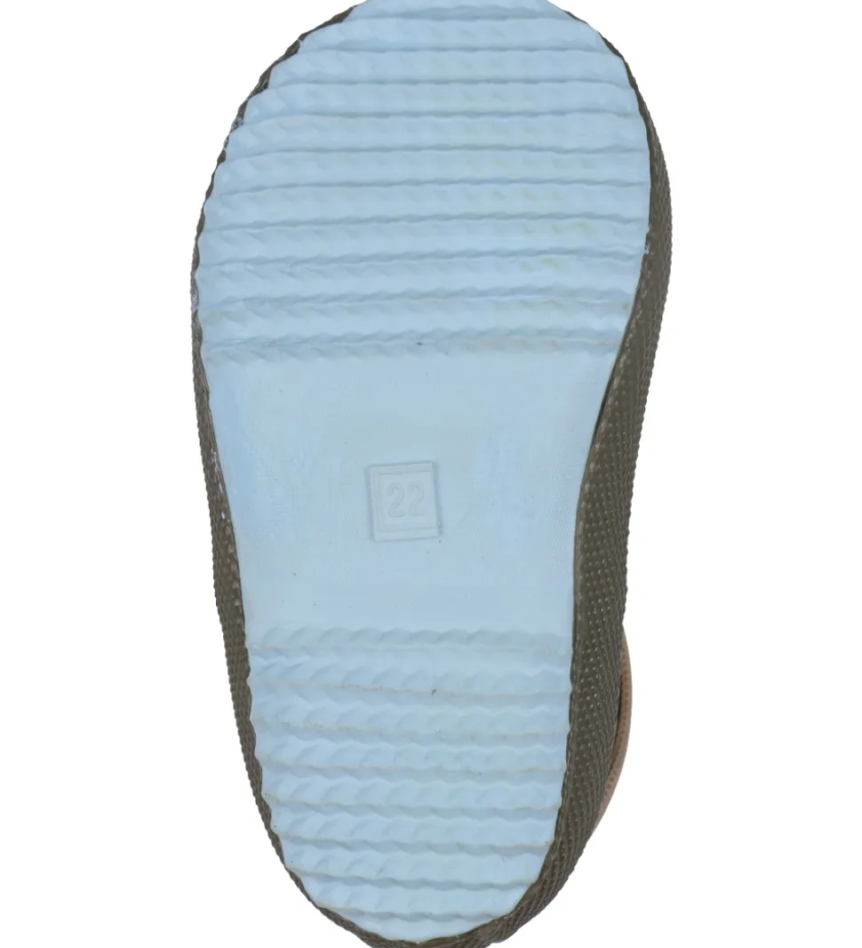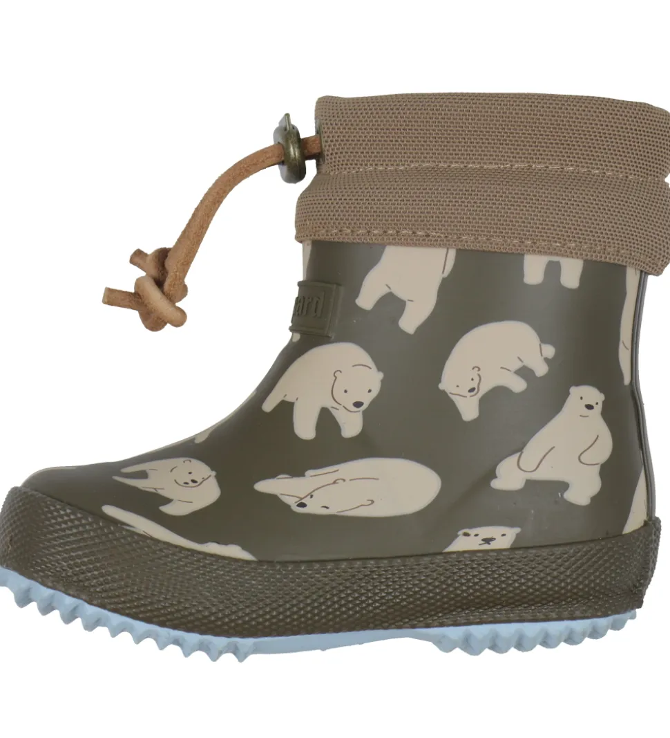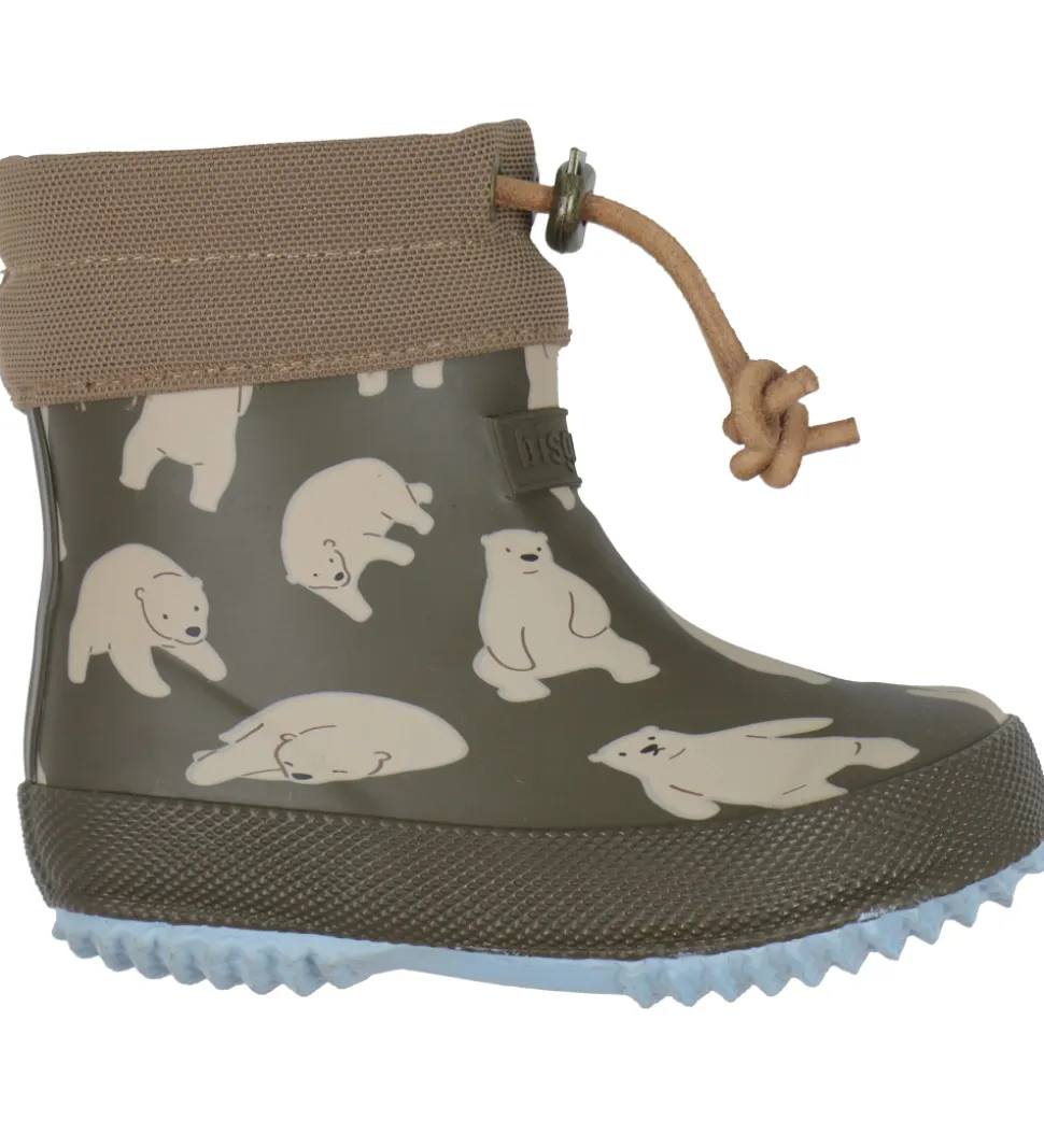 Søde Bisgaard termostøvler i armygrøn med alloverprint af beige bjørne. Toppen er i brun, og under bunden er termostøvlerne lyseblå.