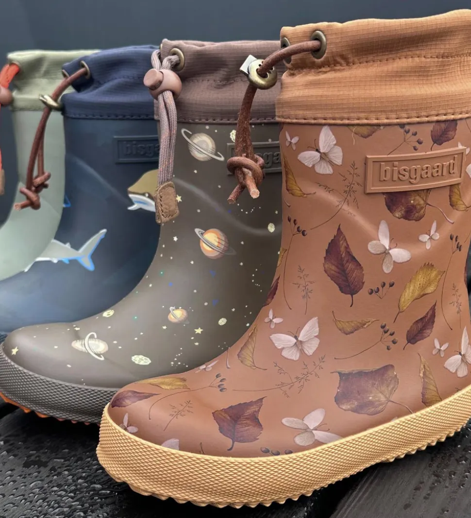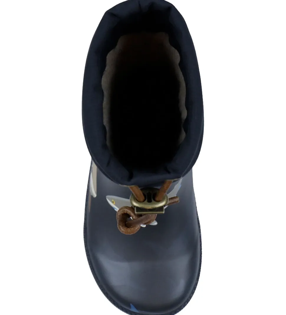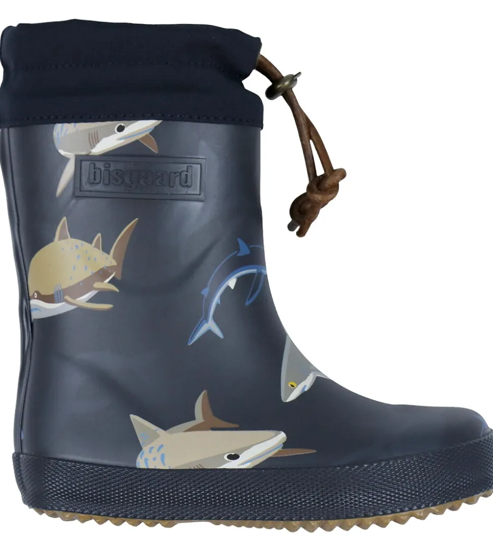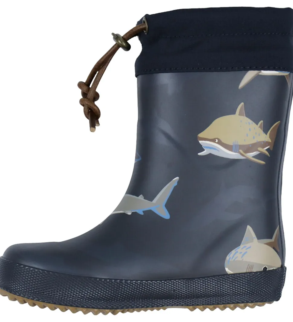 Flotte Bisgaard termostøvler i mørkeblå med print af hajer i brune, blå og grå nuancer.