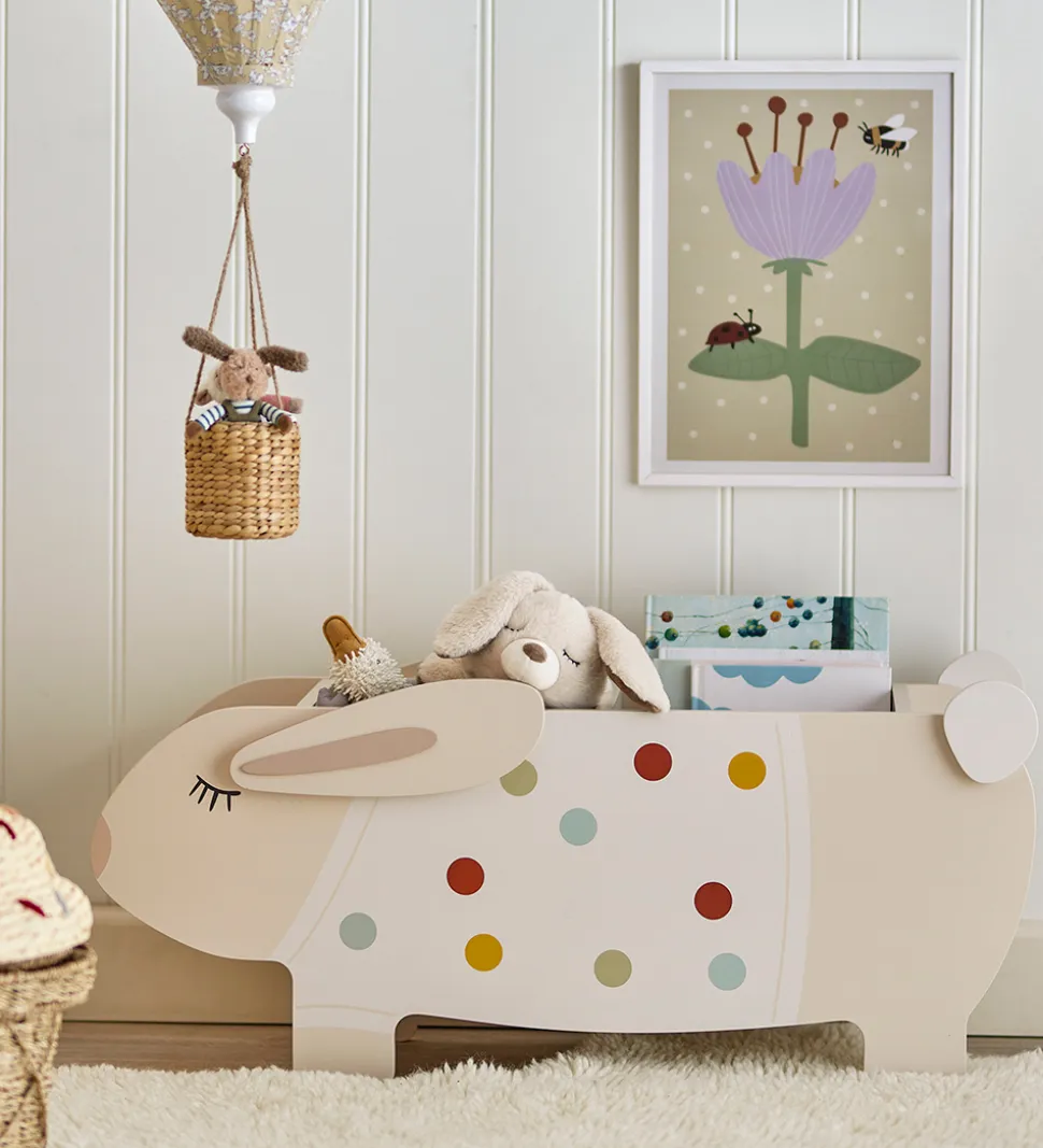 Charmerende Bloomingville bogkasse i form af en beigefarvet kanin med farverige prikker. Bloomingville bogkassen består af to rum, og den tilbyder en dekorativ og funktionel løsning til organisering i hjemmet, samtidig med at den tilfører et legende præg.