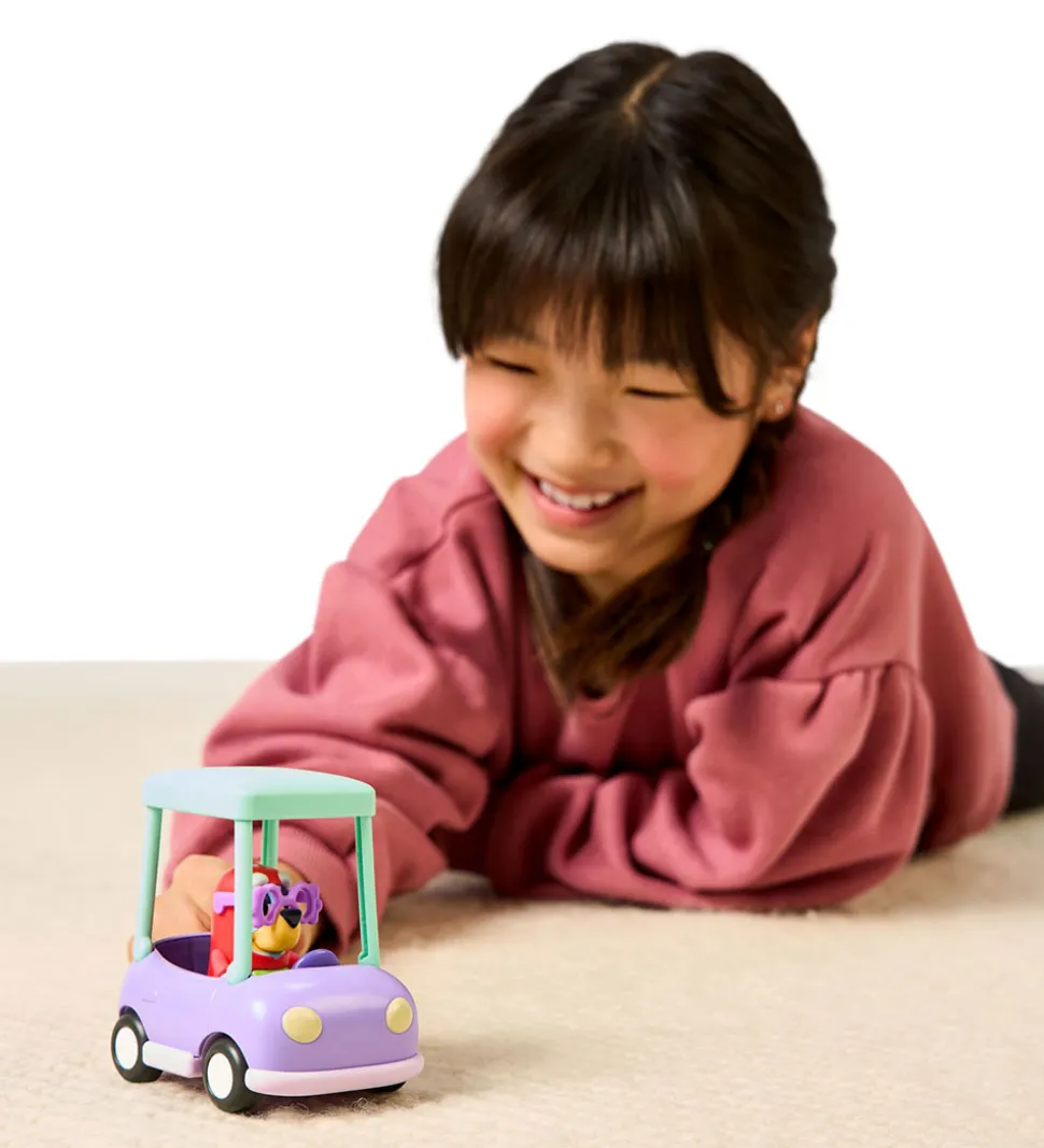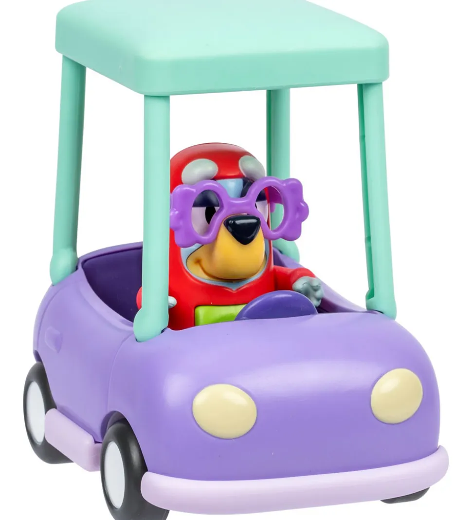 Smart Bluey bil og figur bestående af bedstemors bil og Janet fra Bluey. Janet har et bevægeligt led, så den både kan stå og sidde. Sættet bidrager til fantasifulde lege, hvor man kan bringe scener fra tegneserien til live i legen.