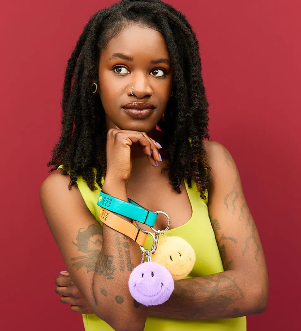 Fin Bon Ton Toys nøglering i form af en rund smiley i gul plys. Derudover er der en grøn rem med teksten “Spread Joy” i orange.