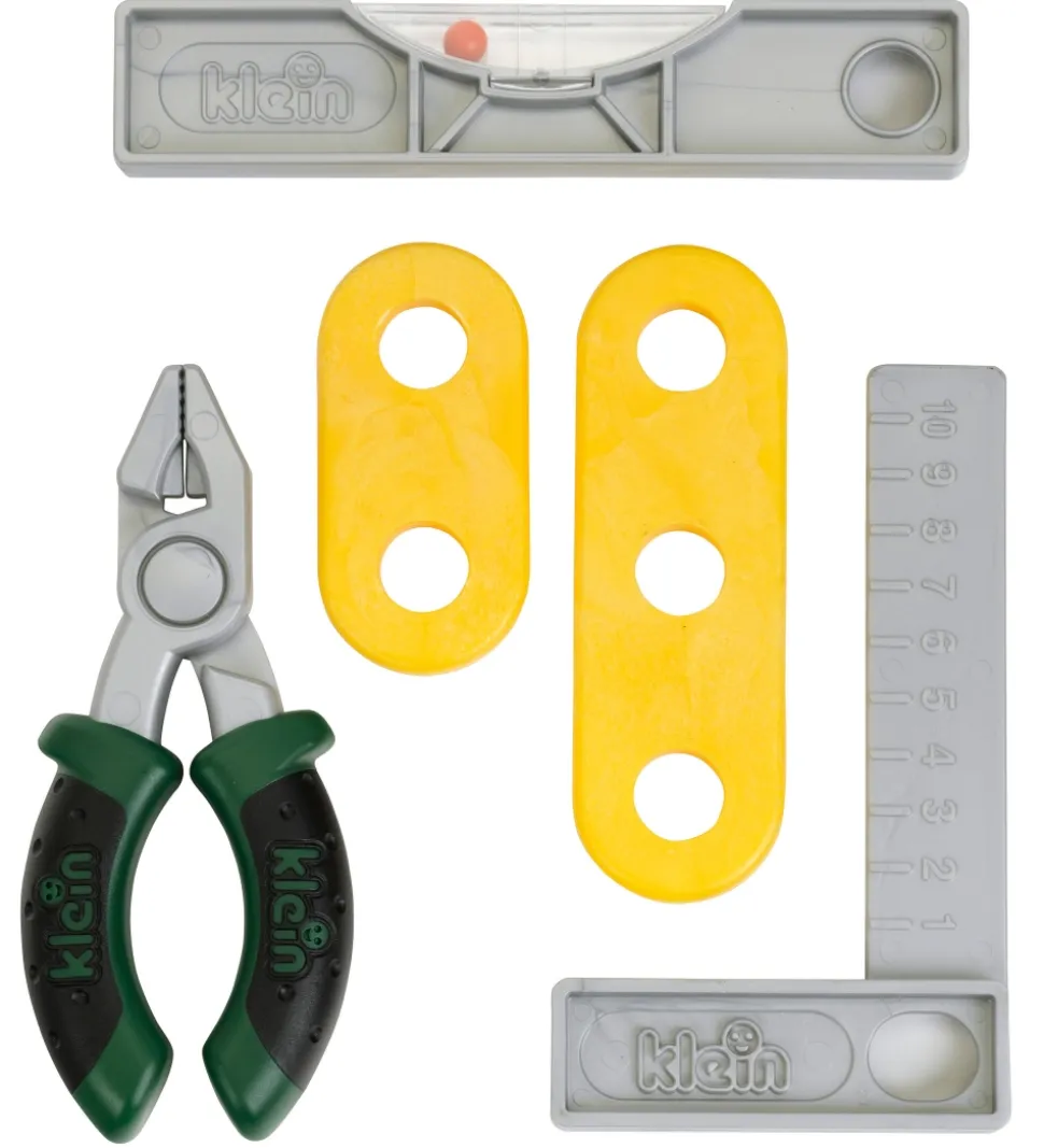 Underholdende Bosch Mini værktøjssæt bestående af en tang, en tommestok, et vaterpas og to plader til møtrikker, i grønne, sølv og gule nuancer.