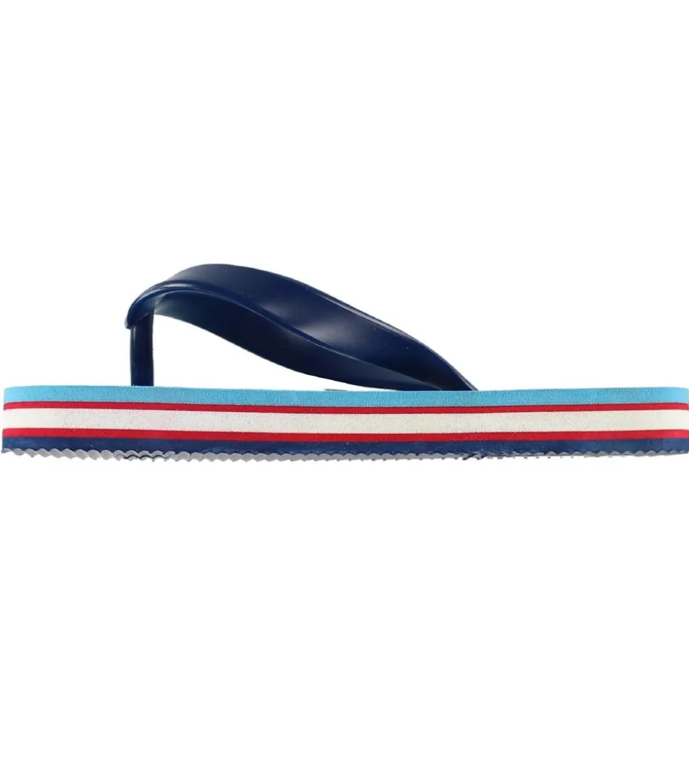Flotte BOSS klipklapper med en turkis indersål, hvid i midten og med en navy ydsersål. De tre farver er adskilt af en smal, rød stribe. På indersålen er der et BOSS-logo i hvid, og stropperne over fødderne er navy med hvide BOSS-logoer.