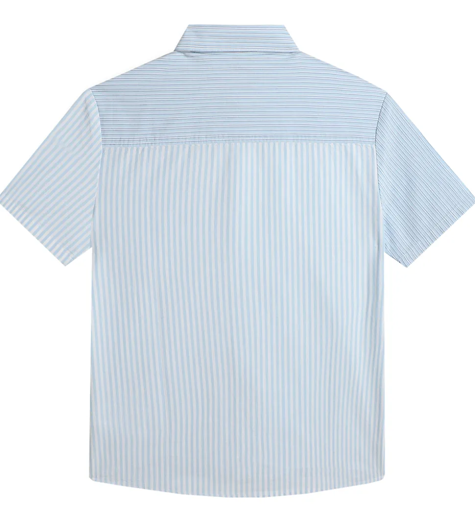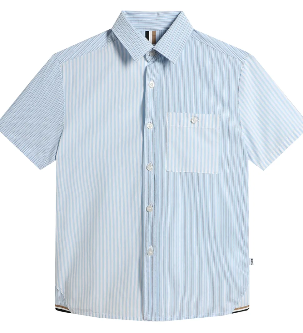 BOSS skjorten har korte ærmer, og i halsåbningen har den en klassisk krave. Fortil i venstre side sidder der en lomme, som lukkes med en lille, hvid knap, og skjorten åbnes fortil med hvide knapper.