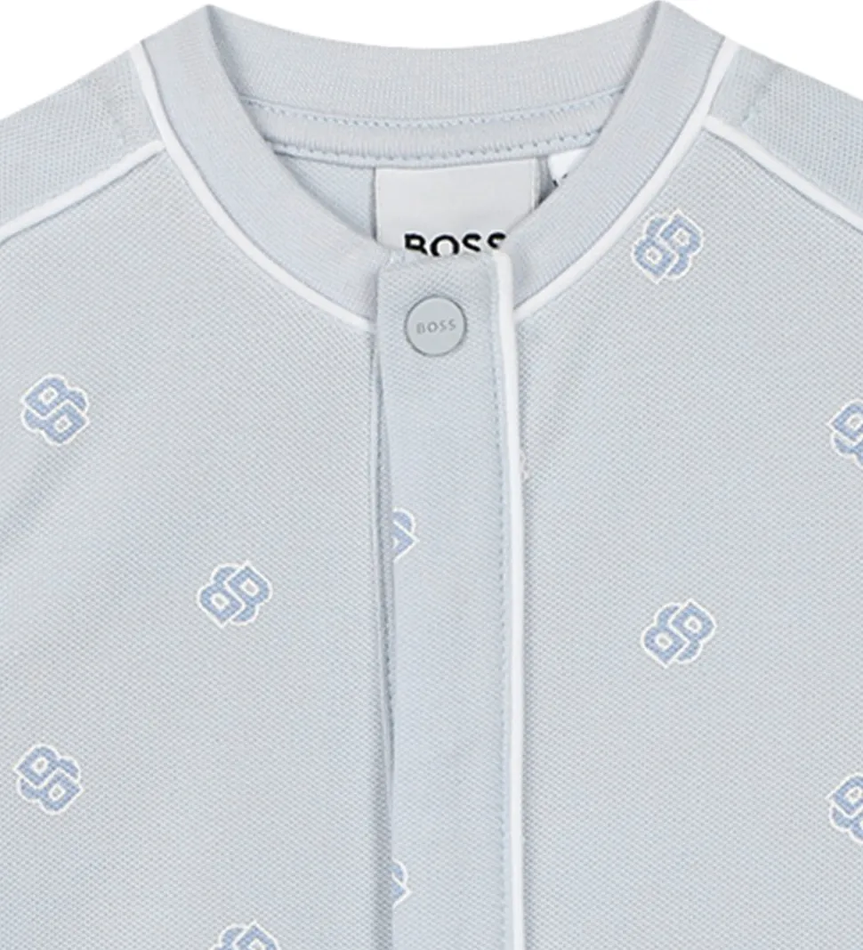 Fin BOSS sommerdragt i lyseblåt piqué med et alloverprint i blå og hvid med to B’er, der er flettet sammen.